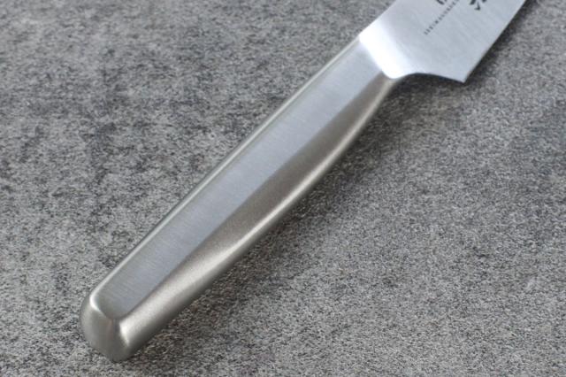 刃からハンドルまでつなぎ目のない、一体型のオールステンレス製コンパクトナイフです。ステンレスの清潔感を活かした凹凸の少ないシンプルな形状です。無駄のない美しいフォルムで、機能性だけでなくデザイン性の高さも魅力の一つです。