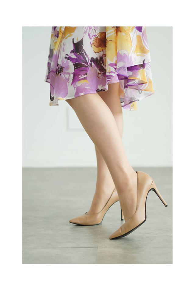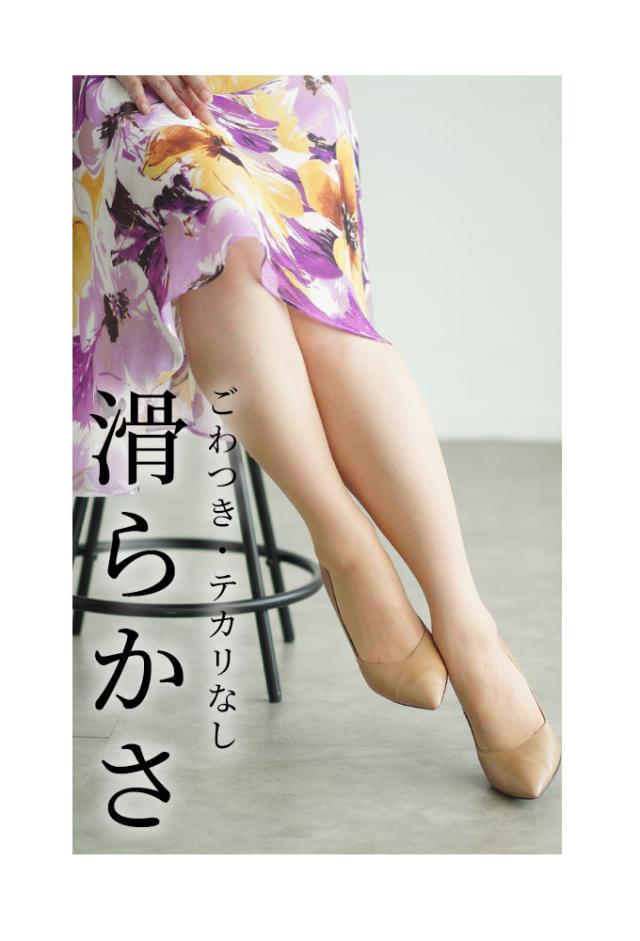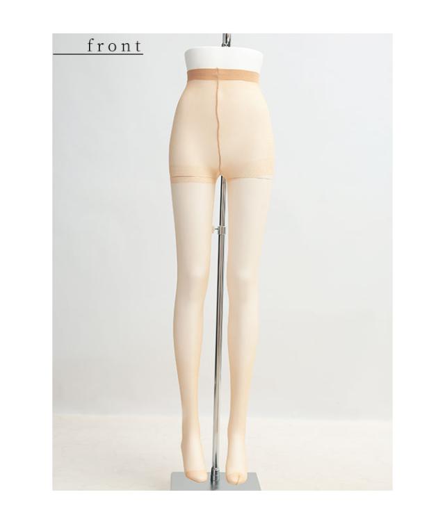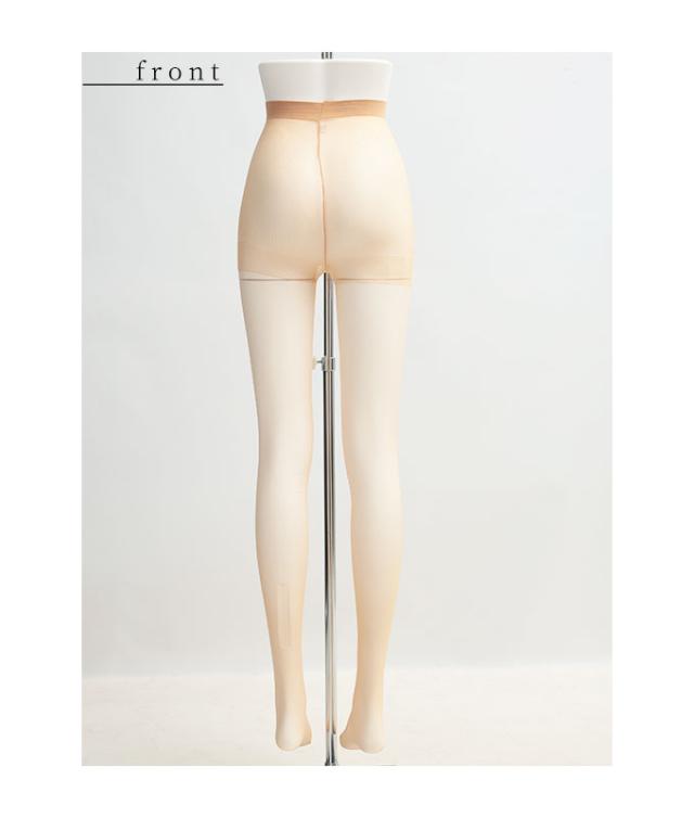 程よいサポート力のあるパンティストッキングです。ウエスト部分は少し幅広のやわらかいゴムで、くい込みすぎたりすることなくフィットします。太ももから足首にかけては段階的にフィットしていく立体設計で、肌にも馴染み透明感があります。バックマーク付きなので前後がひと目でわかるのもうれしいですね。