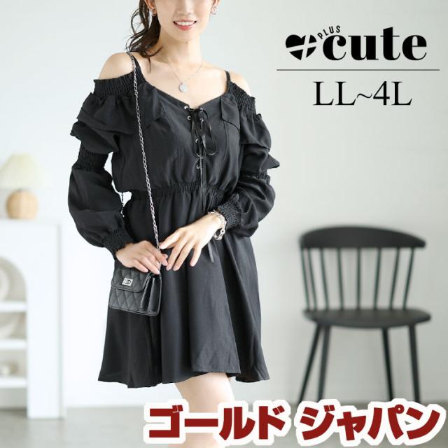 春新作 大きいサイズ レディース ワンピース レースアップオフショルワンピース オフショル 膝上 長袖 シャーリング レースアップ ウエストゴム フレア 無地 カジュアル 秋服 春服 LL 2L 3L 4L ブラック ゴールドジャパン +cute +CUTE +Cute +cute +CUTE プラスキュート