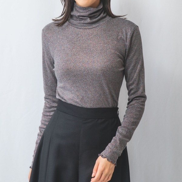 色彩豊かなオーロララメがコーディネートに華やかさを演出するインナー。露出控えめなハイネック仕立てになっているので、首元に落ち着いた印象を与えます。袖口や裾のメロー加工がさりげないアクセントに。程よいフィット感を実現する薄手の素材感が魅力的です。トップスとして着用するのはもちろん、レイヤード次第で様々な表情へと変化するアイテムです。