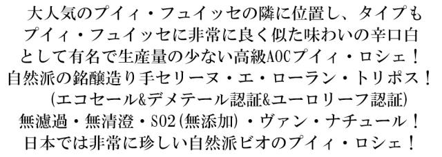 大人気のプイィ・フュイッセの隣に位置し、タイプも プイィ・フュイッセに非常に良く似た味わいの辛口白 として有名で生産量の少ない高級AOCプイィ・ロシェ! 自然派の銘醸造り手セリーヌ・エ・ローラン・トリポス! (エコセール&デメテール認証&ユーロリーフ認証) 無濾過・無清澄・SO2(無添加)・ヴァン・ナチュール! 日本では非常に珍しい自然派ビオのプイィ・ロシェ!