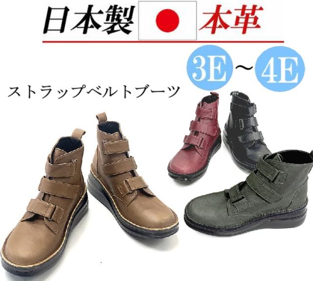 日本製 本革 ショートブーツ レディース ブーツ ウェッジ 厚底 幅広 3e 4e 外反母趾 レザー レースアップブーツ レザーブーツ ショート ベルト レースアップ コンフォート