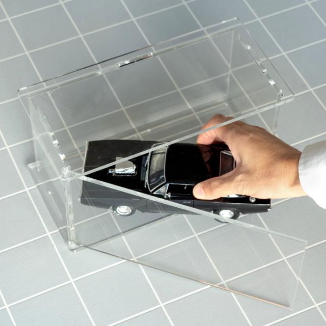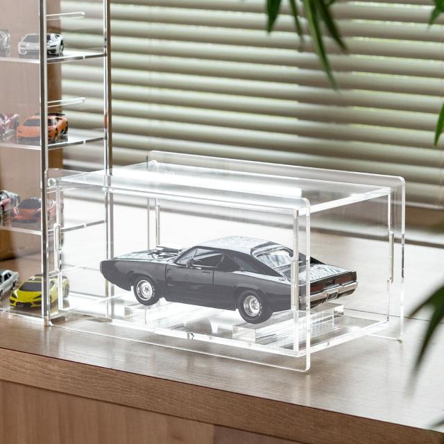 大切なコレクションをホコリや汚れから守りながら美しく飾って楽しめるディスプレイケースです。1/24サイズの車模型を飾るのにピッタリなサイズです。車体を浮かせて美しく飾れる台座付きです