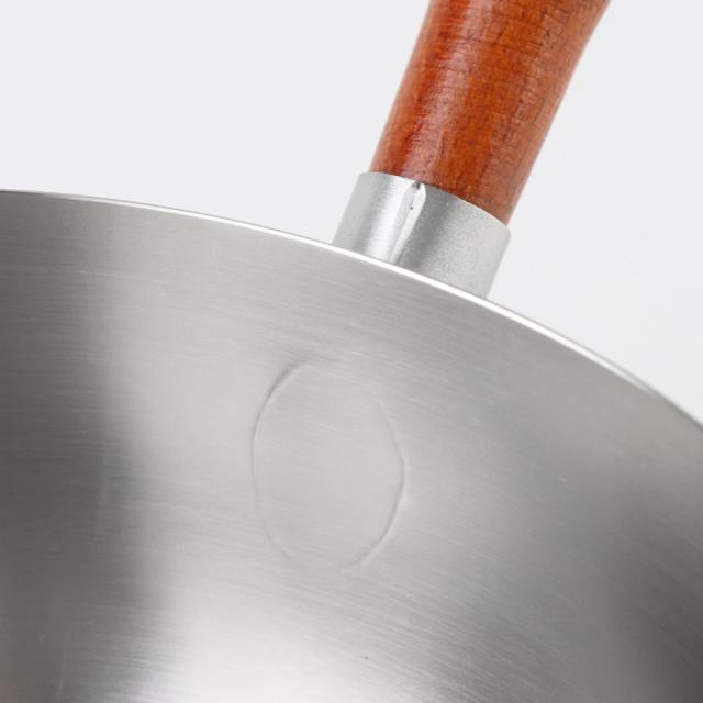 サビや焦げ付きに強いステンレス製です。アルミのように変色しないので、食材や調味料を選ばず、どんな料理にも使いやすいのが特徴です。また、丸みのある持ち手は、手に馴染んで握りやすい温かみのあるブナ材を使用しています。