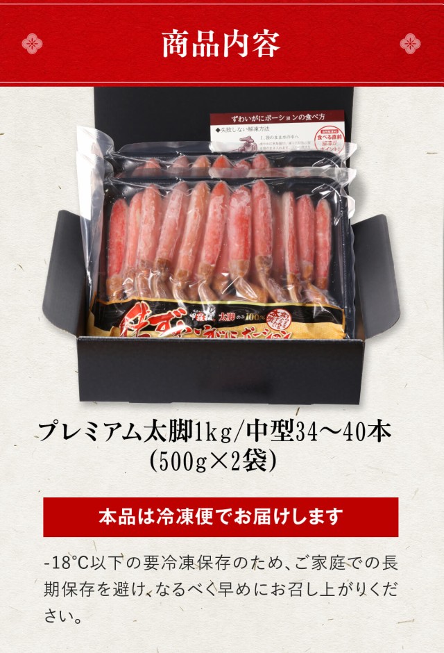 【お刺身OK】生ずわいがにプレミアム太脚ポーション1kg/中型34〜40本(500g×2袋) かに 蟹 カニ ズワイガニ ポーション 鍋 しゃぶしゃぶ 焼き trend_kaisen 年末お届け可能 冬ギフト 年末年始 お歳暮 御歳暮