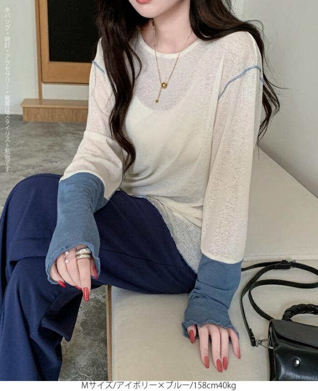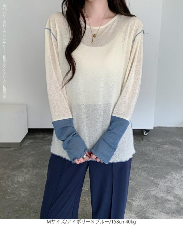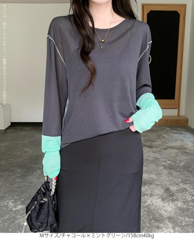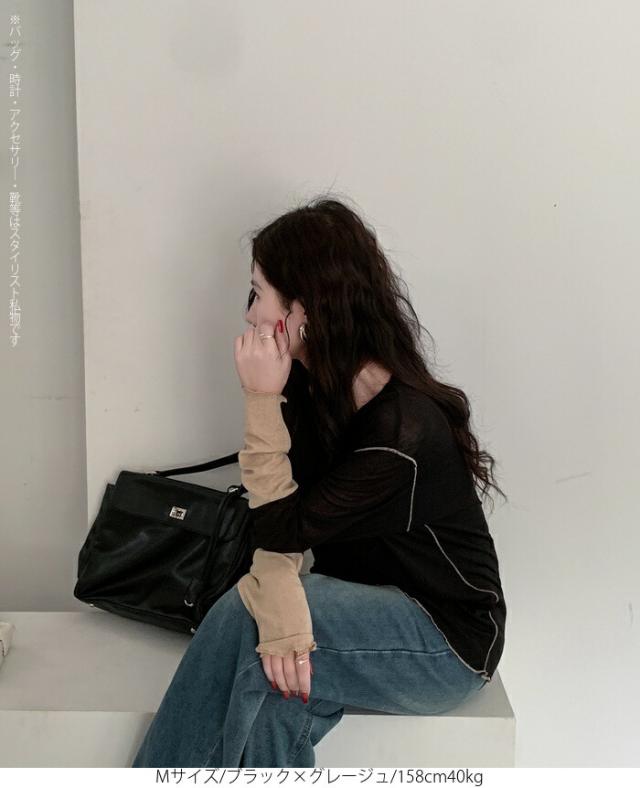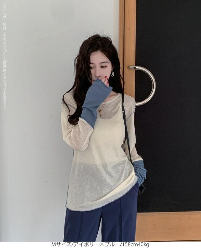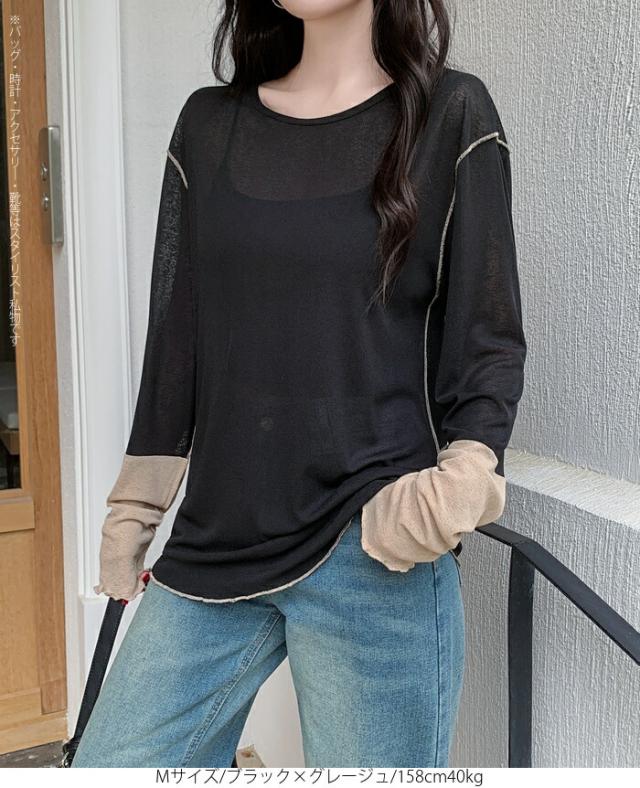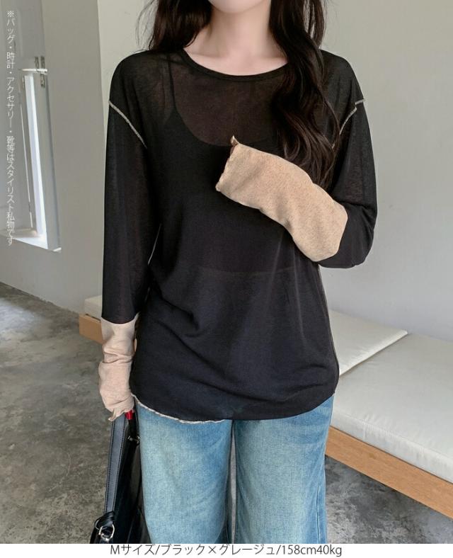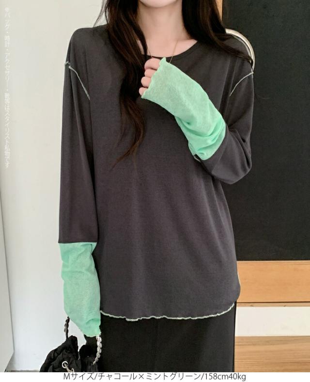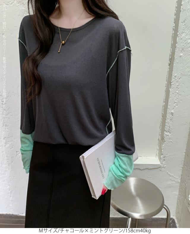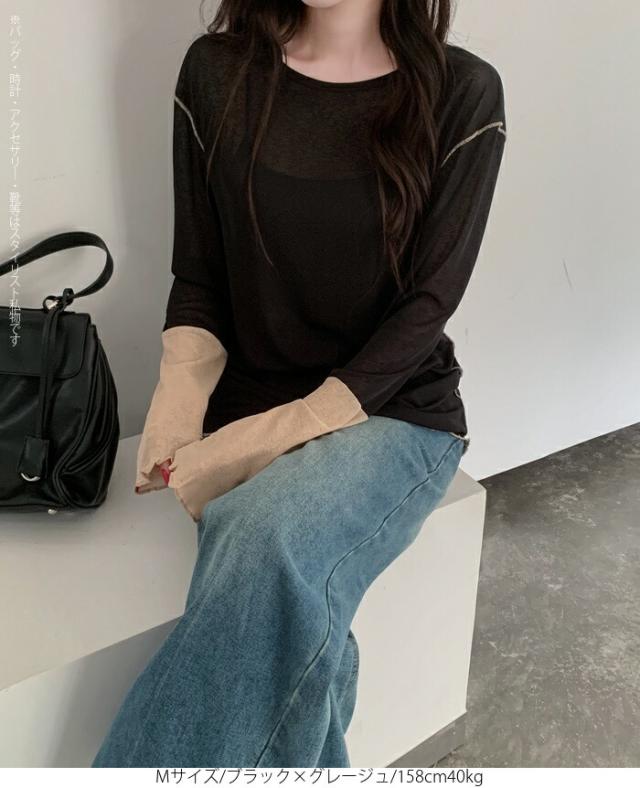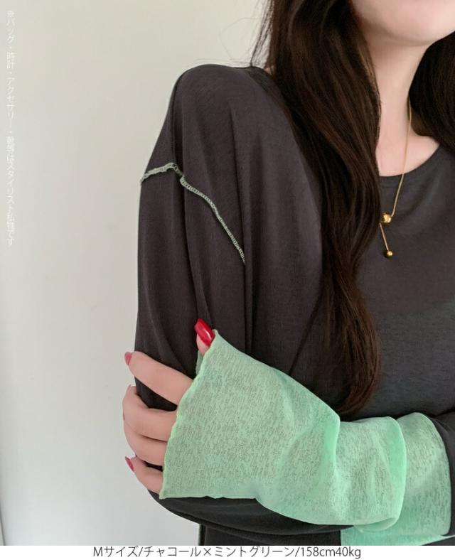 50%OFFクーポン対象! ロンT シアー レイヤード トップス tシャツ レディース 長袖 透け感 バイカラー 配色袖 パイピング ステッチ ゆったり 体型カバー 韓国 大人カジュアル UV 紫外線 【 シアーカフスカットソー 】