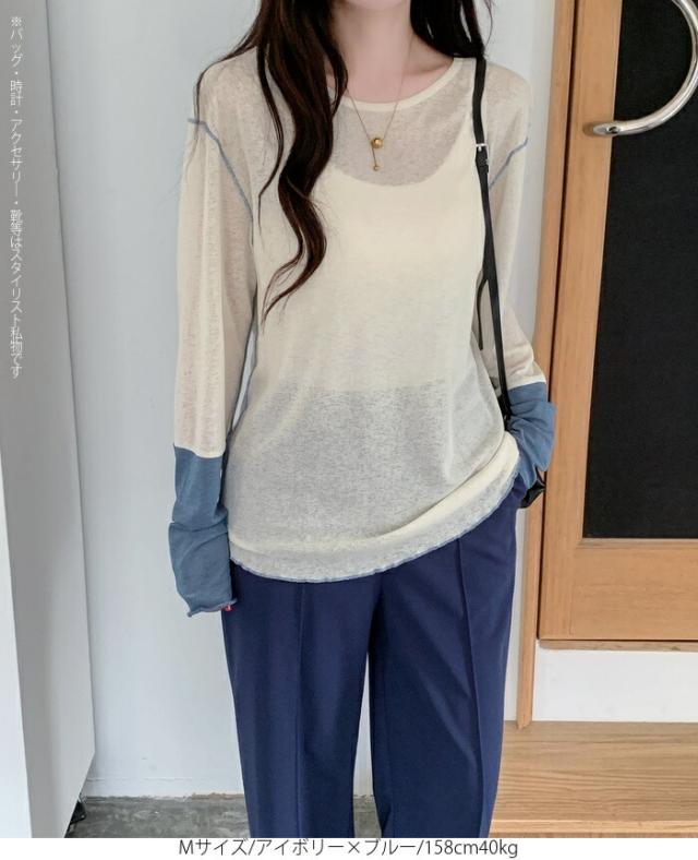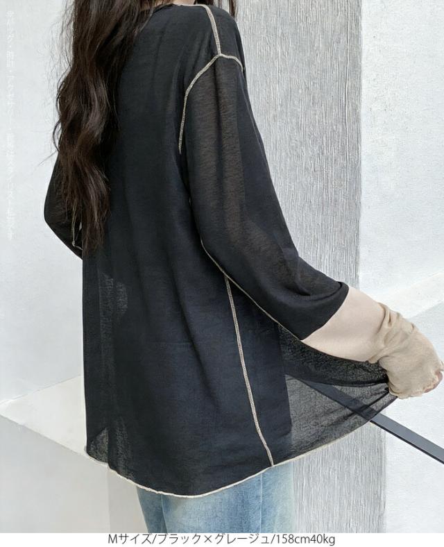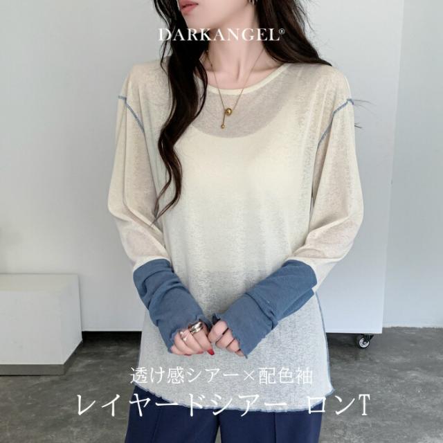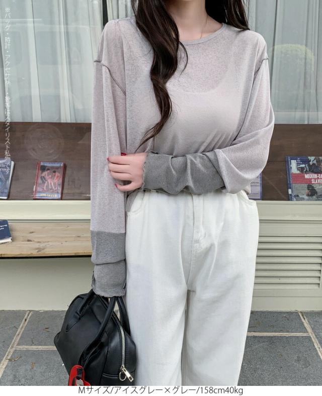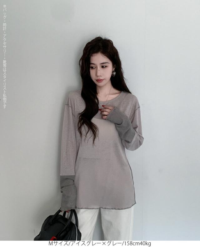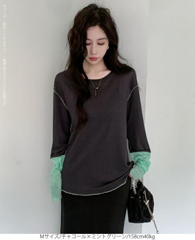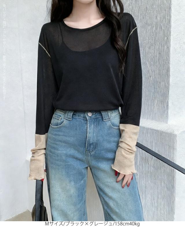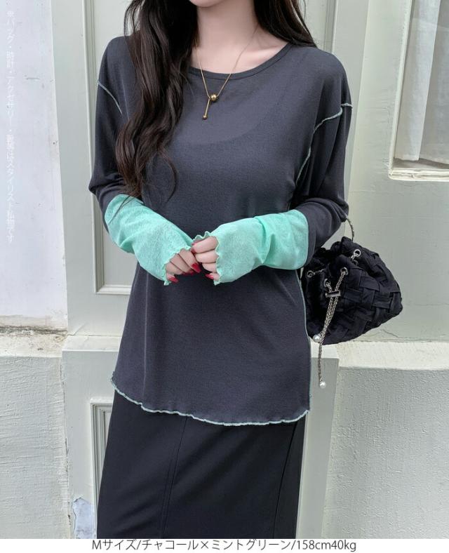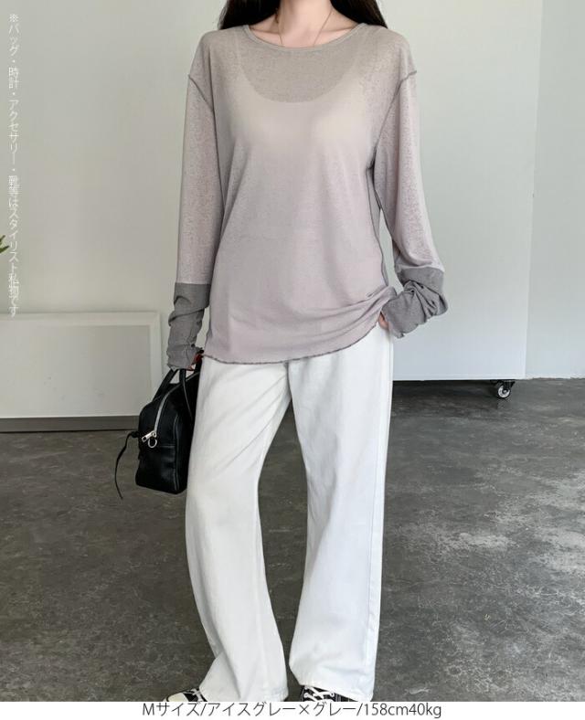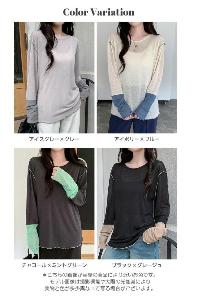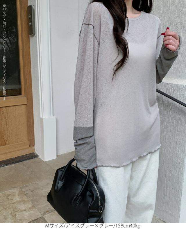 50%OFFクーポン対象! ロンT シアー レイヤード トップス tシャツ レディース 長袖 透け感 バイカラー 配色袖 パイピング ステッチ ゆったり 体型カバー 韓国 大人カジュアル UV 紫外線 【 シアーカフスカットソー 】