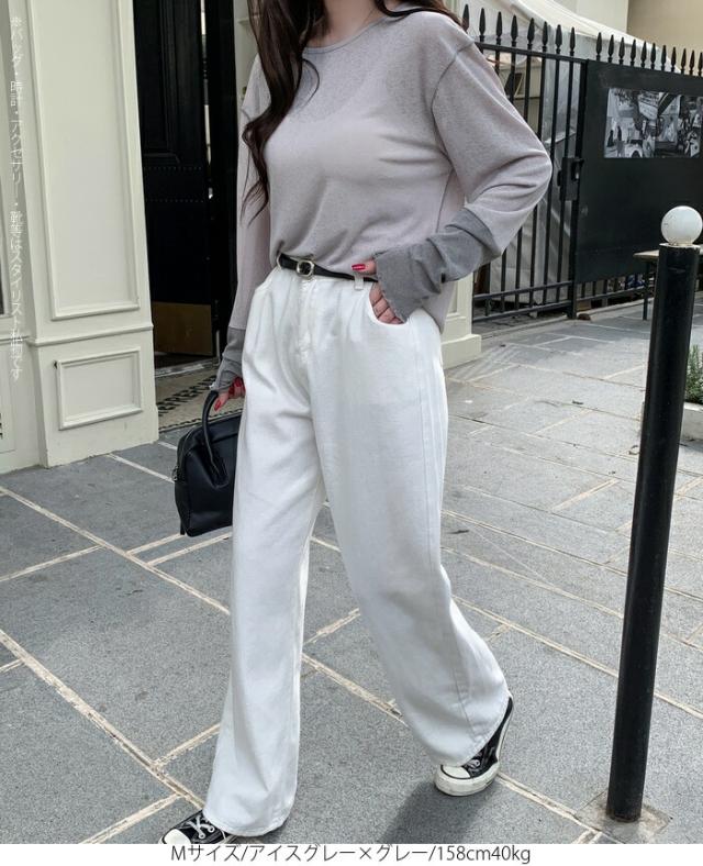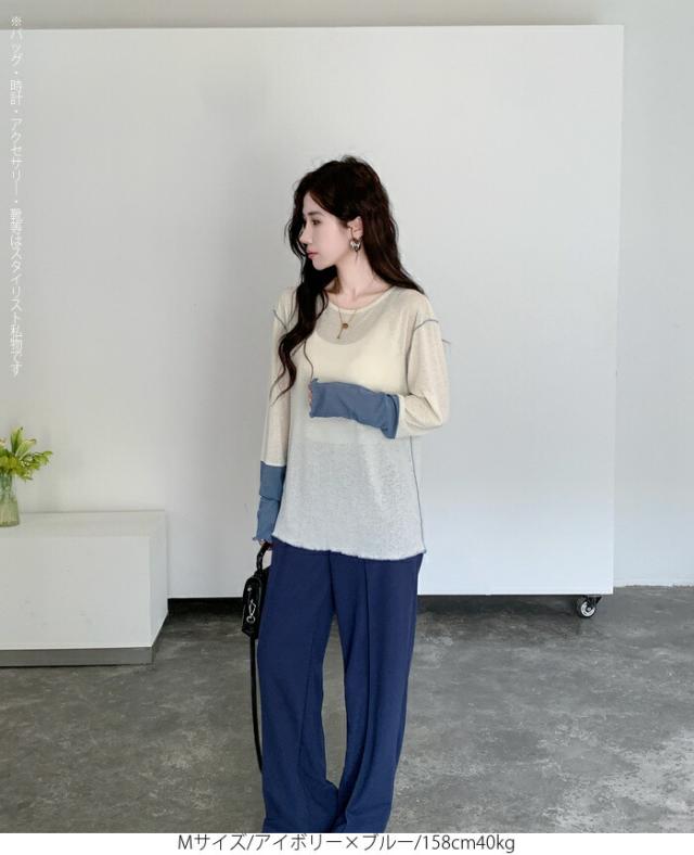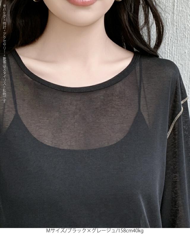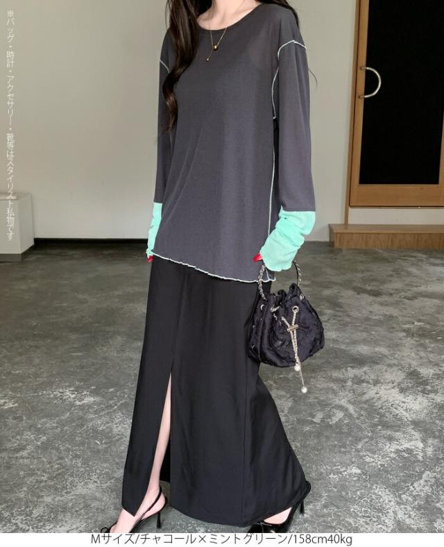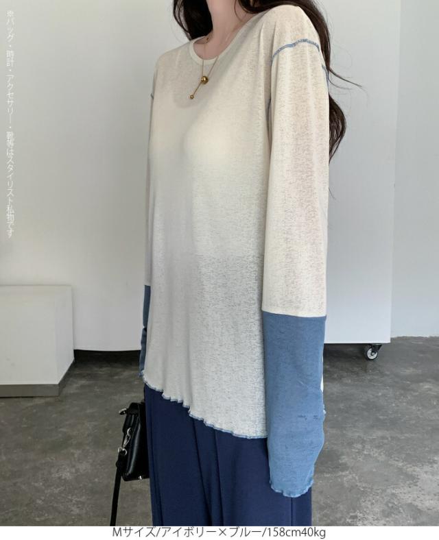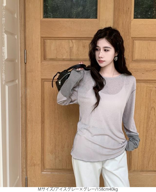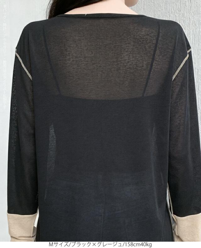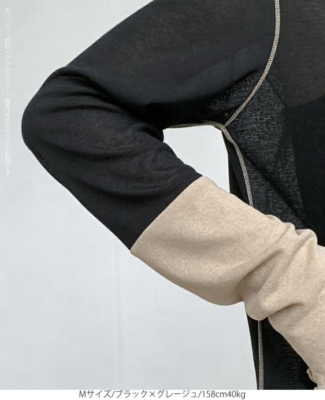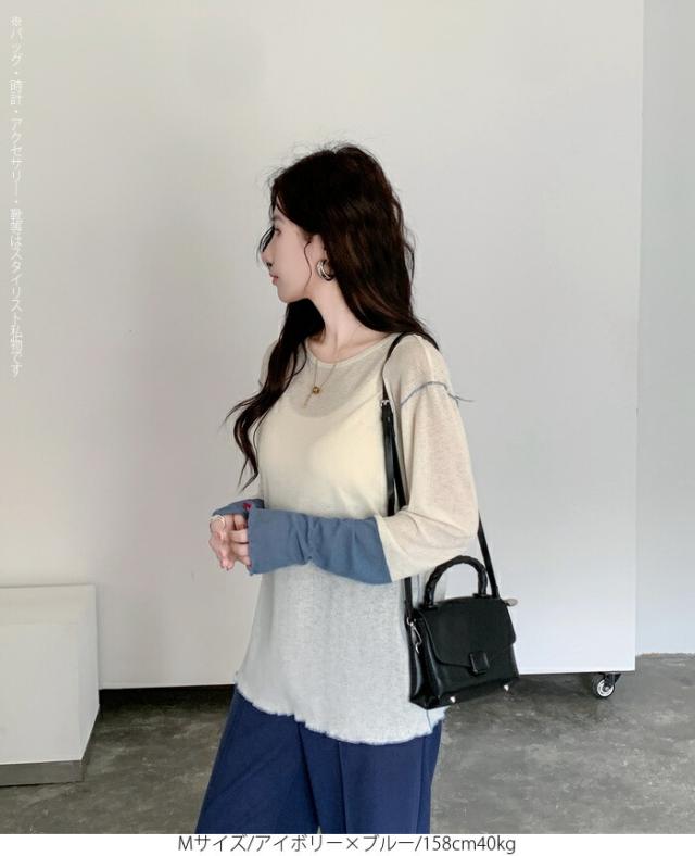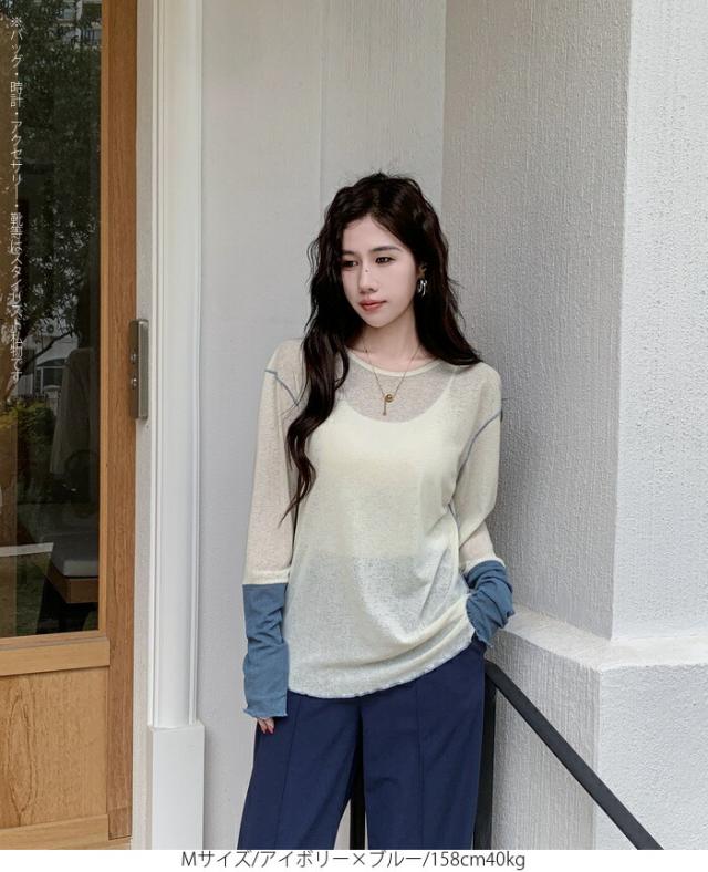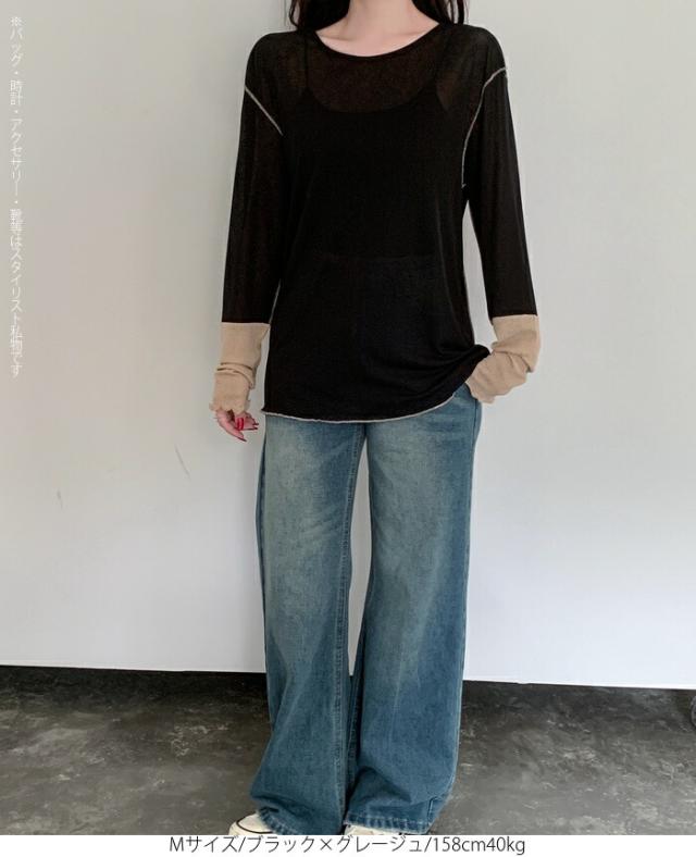 50%OFFクーポン対象! ロンT シアー レイヤード トップス tシャツ レディース 長袖 透け感 バイカラー 配色袖 パイピング ステッチ ゆったり 体型カバー 韓国 大人カジュアル UV 紫外線 【 シアーカフスカットソー 】