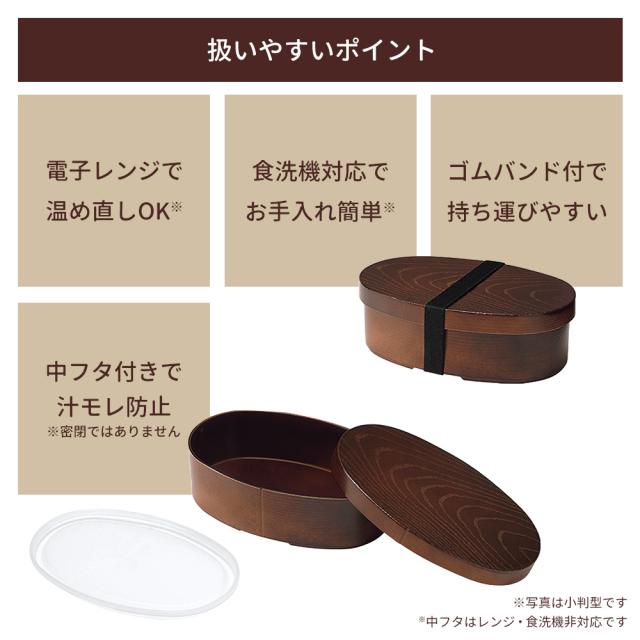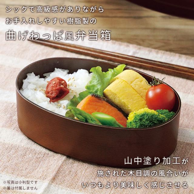 シックで高級感がありながら、お手入れしやすい樹脂製の曲げわっぱ風お弁当箱。