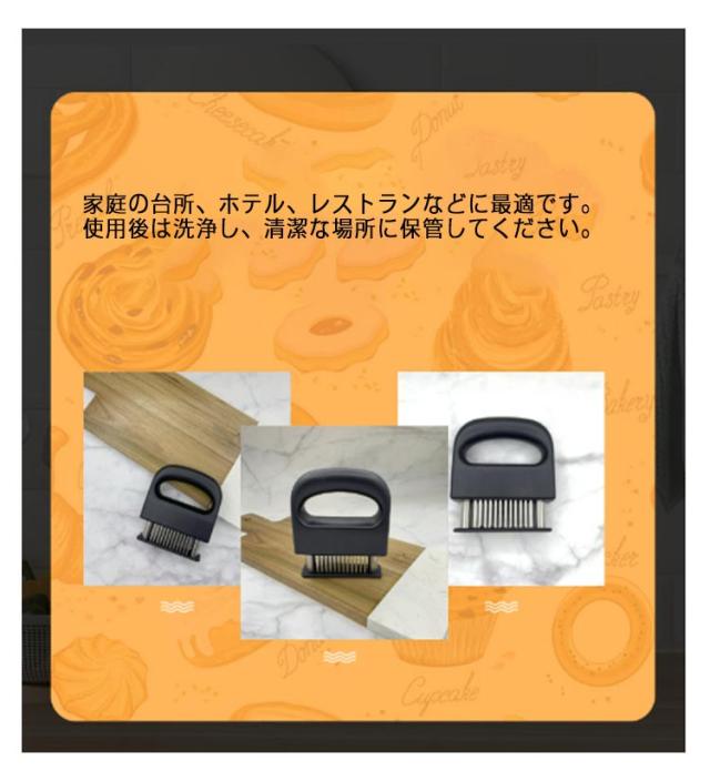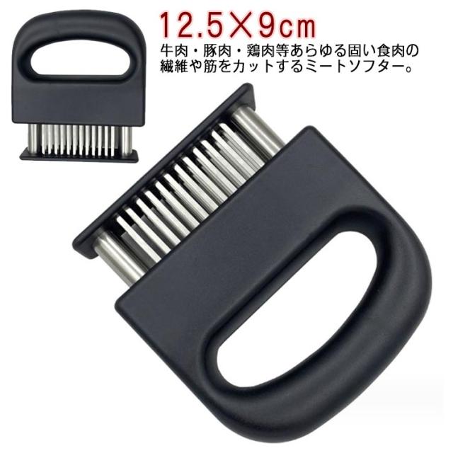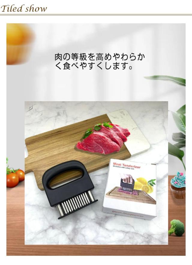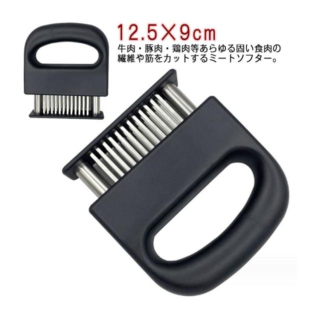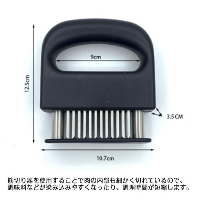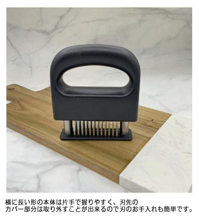 | 牛肉・豚肉・鶏肉等あらゆる固い食肉の繊維や筋をカットするミートソフター。肉の等級を高めやわらかく食べやすくします。 筋切り器を使用することで肉の内部も細かく切れているので、調味料などが染み込みやすくなったり、調理時間が短縮します。 刃が細かいので肉汁や風味を損なうことがほとんどありません。 横に長い形の本体は片手で握りやすく、刃先のカバー部分は取り外すことが出来るので刃のお手入れも簡単です。 家庭の台所、ホテル、レストランなどに最適です。 使用後は洗浄し、清潔な場所に保管してください。 | |