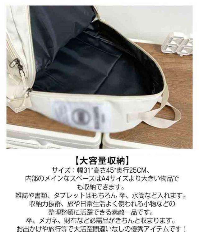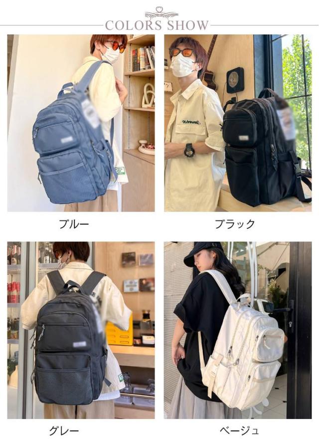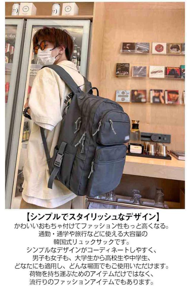 | 【大容量収納】サイズ:幅31*高さ45*奥行25cm、内部のメインなスペースはA4サイズより大きい物品でも収納できます。雑誌や書類、タブレットはもちろん 傘、水筒など入れます。収納力抜群、旅や日常生活よく使われる小物などの整理整頓に活躍できる素敵一品です。傘、メガネ、財布など必需品がきちんと収まります。お出かけや旅行等で大活躍間違いなしの優秀アイテムです! 【撥水・防汚れ加工】表面には防水加工が施されており、効果的に中身を保護することができます。突然の雨などでちょっと濡れても、サッと拭き取りてお手入れも楽々。軽くて耐久性に抜群で、異臭がしません。金属製の滑りやすいファスナーはしっかりしており、軽量で毎日安全にお使いいただけます。ショルダーストラップとポケットの縫い目は、補強されており、バックパックの耐久性が向上しています。 【快適なクッションベルト】肩ベルトの幅が広いので荷物の重量を分散しやすい。クッション性が高いメッシュ素材を使用しており、不快な蒸気を効果的に逃がします。 【シンプルでスタイリッシュなデザイン】かわいいおもちゃ付けてファッション性もっと高くなる。通勤・通学や旅行などに使える大容量の韓国式リュックサックです。シンプルなデザインがコーディネートしやすく、男子も女子も、大学生から高校生や中学生、どなたにも適用し、どんな場面でもご使用いただけます。荷物を持ち運ぶためのアイテムだけではなく、流行りのファッションアイテムでもあります。 | |
