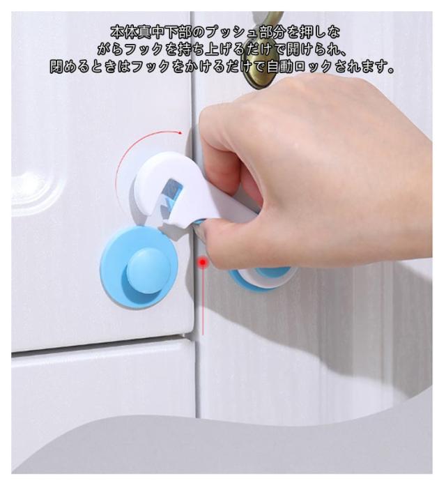 | サイズについての説明 | サイズ:約9.5*3.6cm/個 ※商品のサイズは手作業で測定させて頂いておりますので、若干の誤差があります。 【使用方法】 本体の真ん中部分を押しながらフックを上げると、扉を開けることが出来ます。 ロックする時はフックを下すだけです。カチッとなるまで下ろします。 【設置方法】 取り付け面(扉など)のホコリ、汚れ、湿気、油分をきれいに拭き取り、乾かしてください。 本体裏面の両面テープの剥離紙をはがします。 取り付ける扉の上端から10cm以上間隔を空け、両側の扉に水平になるように強く押し付けながら貼り付けます。 |