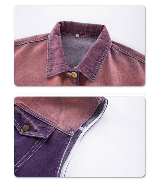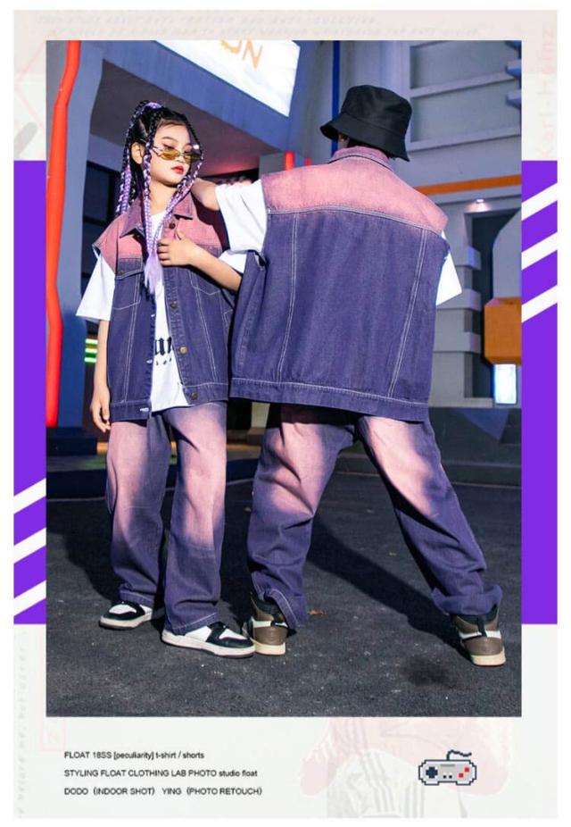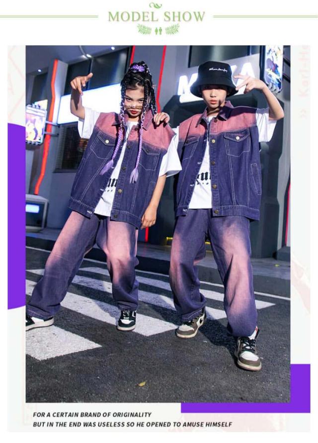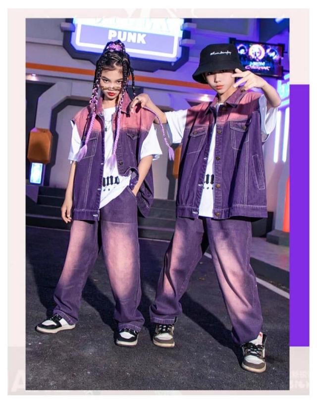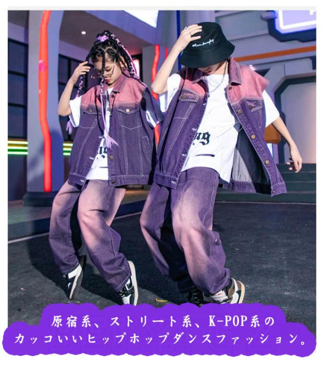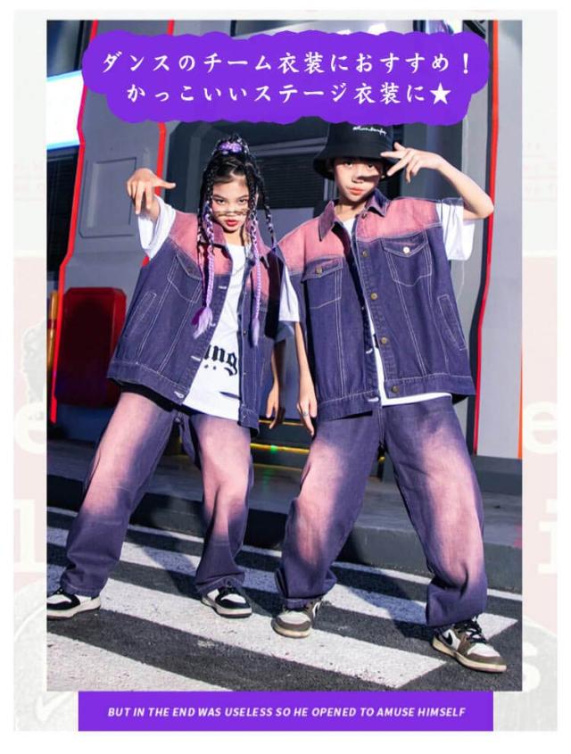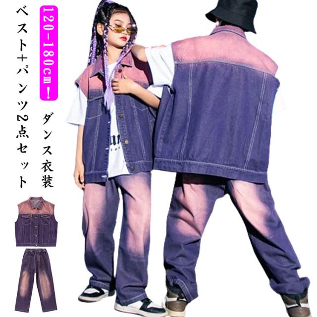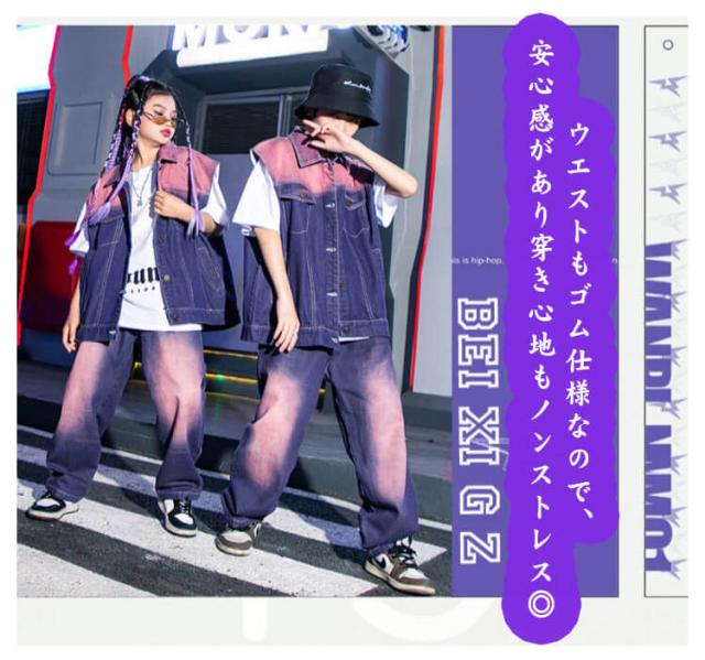 紫 子供 ダンス衣装 キッズ デニム ベスト セットアップ 絞り染め デニムシャツ 男の子 2点セット ジャズダンス ロングパンツ 女の子 長ズボン ヒップホップ 演出服 ジュニア かっこいい ゆったり 団体服 応援団 イベント 発表会 文化祭 キッズ 体育祭