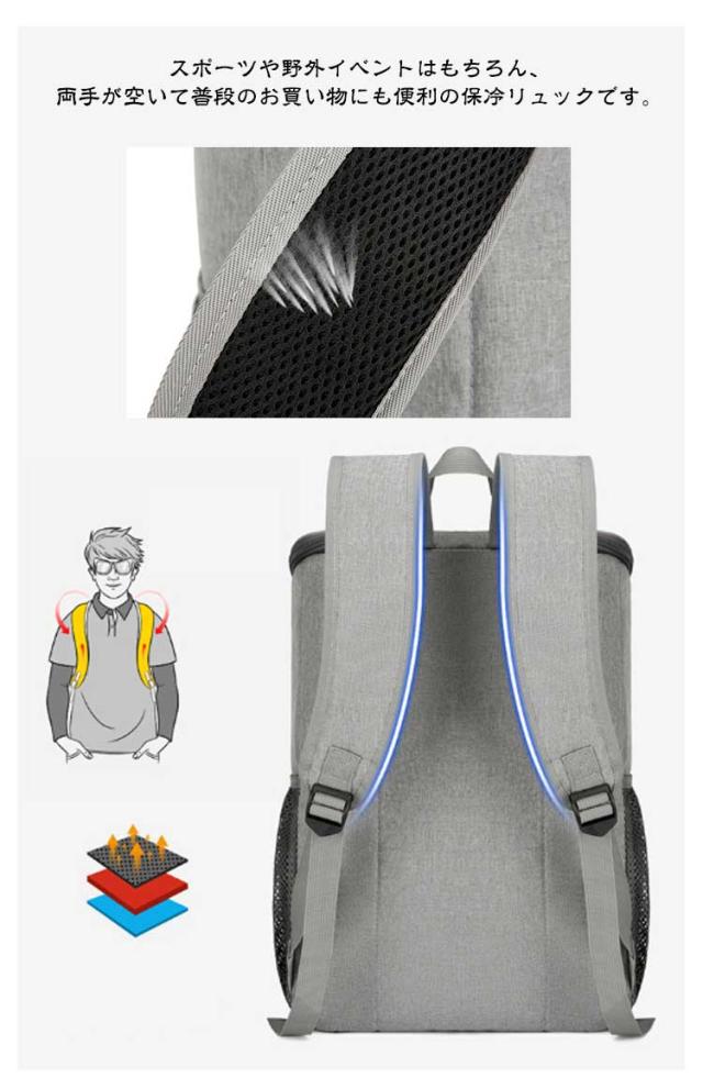 | 保冷性と保温性に優れ軽くて大容量なリュックタイプのクーラーバッグです。 防水性、防塵性に優れキャンプやアウトドア、 スポーツや野外イベントはもちろん、両手が空いて普段のお買い物にも便利の保冷リュックです。 大きく開いて出し入れしやすいスクエアタイプの保冷保温リュックです。 クッション性のある断熱材が入った構造の保冷機能だから、お買い物やレジャーにぴったり! 様々なシーンで活躍!キャンプ・釣り・ピクニック・アウトドア・バーベキュー・お花見・運動会・普段のお買い物など、飲み物のクールさを保つことができますし、食材の新鮮さを保つことができます。 | |