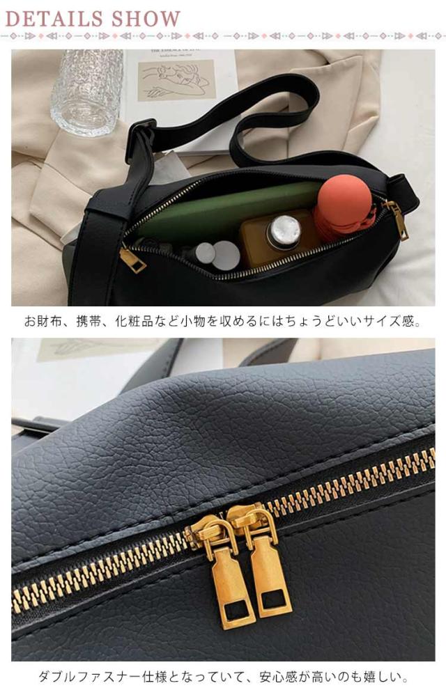 | 通勤やお出かけなど日常使いに最適♪ お財布、携帯、化粧品など小物を収めるにはちょうどいいサイズ感。 幅広めの肩ベルトで肩への食い込みが軽減、バックル付きなので長さもラクラク。 ダブルファスナー仕様となっていて、安心感が高いのも嬉しい。 高級感のフェイクレザーを素材にして、さりげなくコーデを格上げ。 | |