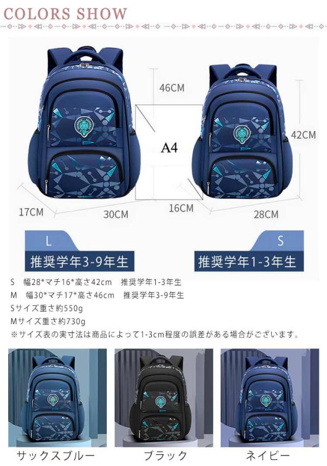 | サイズについての説明 | S 幅28*マチ16*高さ42cm 推奨学年1-3年生 M 幅30*マチ17*高さ46cm 推奨学年3-9年生 Sサイズ重さ約550g Lサイズ重さ約730g ※サイズ表の実寸法は商品によって1-3cm程度の誤差がある場合がございます。 |