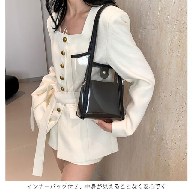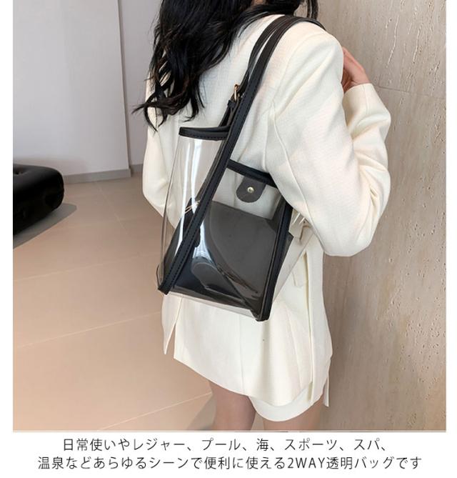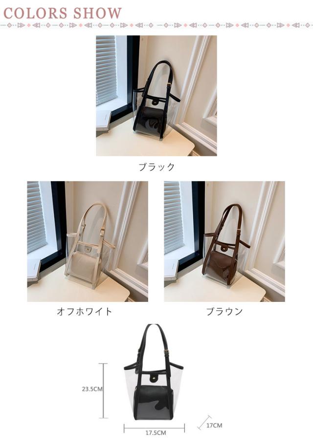 | 2WAYクリアバッグ。 インナーバッグ付き、中身が見えることなく安心です。 インナーバッグ単体でポーチとしてもお使い頂けます。 日常使いやレジャー、プール、海、スポーツ、スパ、温泉などあらゆるシーンで便利に使える2WAY透明バッグです。 | |