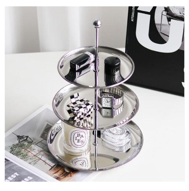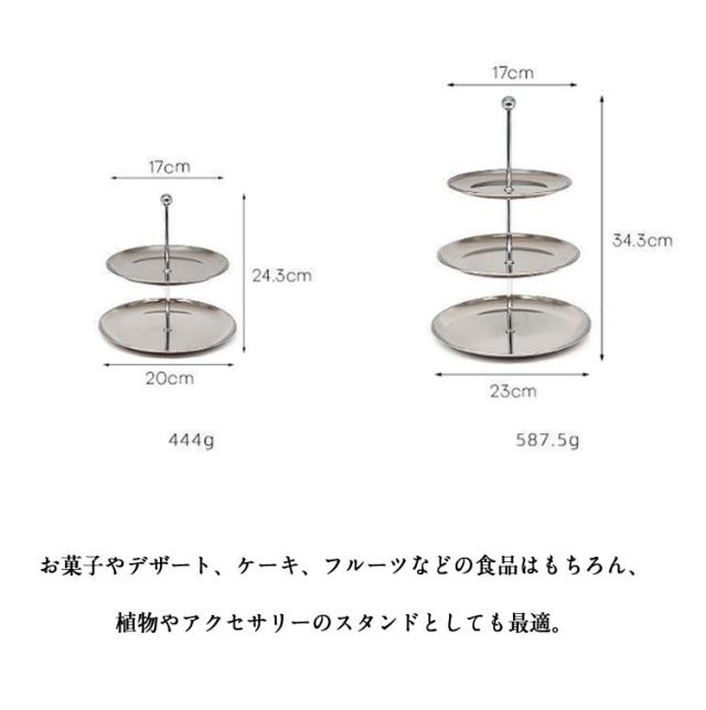 | シンプルなデザインで高級感のあるステンレス製2段/3段ケーキスタンドです。 テーブルの上もスッキリと見せることができ、2段/3段ラックの作りはテーブル上のスペースも有効に活用することができます。 お菓子やデザート、ケーキ、フルーツなどの食品はもちろん、植物やアクセサリーのスタンドとしても最適。 クリスマスや誕生日のパーティー、アフタヌーンティータイムをぐっと華やかにします。 汚れた時は水洗いができます。 | |