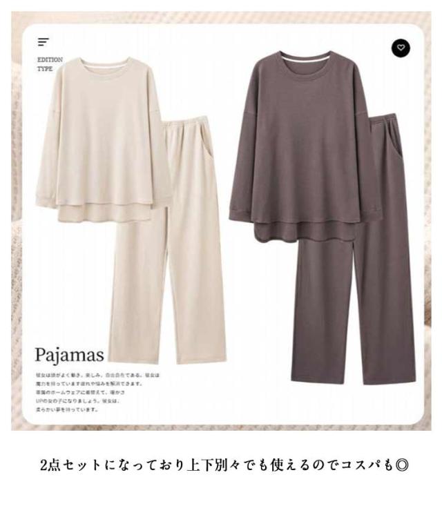 | やわらかく、ソフトな風合いのワッフル生地を使用したルームウェア上下セット。【男女兼用】 トップスはドロップショルダーと前後差をつけた裾のデザインで抜け感を演出。 脚のラインを拾わずゆったりした穿き心地のロングパンツ。 軽やかで適度な通気性、保温性のあるワッフル生地は温度調節の難しい季節やエアコン冷え対策にぴったり。 ちょっとそこまで出かけるワンマイルウェアとしても使える上下セットルームウェア 2点セットになっており上下別々でも使えるのでコスパも◎ | |