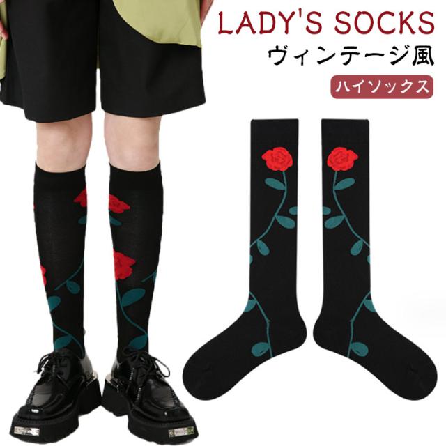ヴィンテージ風 秋色 靴下 レディース ひざ下 靴下 ローズ 北欧 ソックス フラワー 靴下 秋冬 花柄 バラ ロング 靴下 ヴィンテージ風 おしゃれ ソックス 花柄 ハイソックス ひざ下丈 靴下