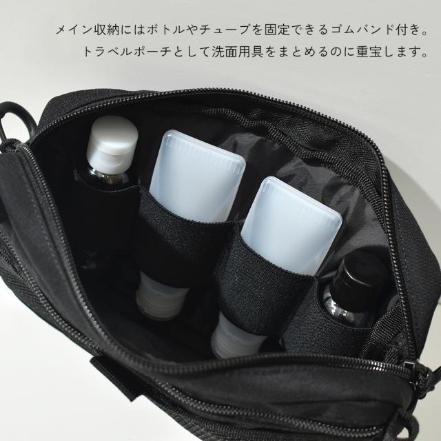 メイン収納にはボトルやチューブを固定できるゴムバンドが付いているので、