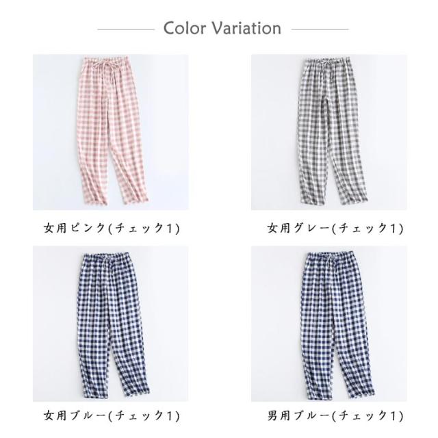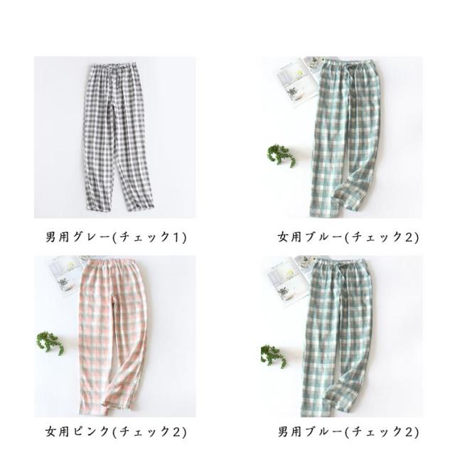 ペアルック ルームパンツ パジャマ ズボン レディース メンズ ガーゼ 綿100% パジャマパンツ 和風 チェック柄 ウエストゴム ボトムス ルームウエア ゆったり 春 夏 秋