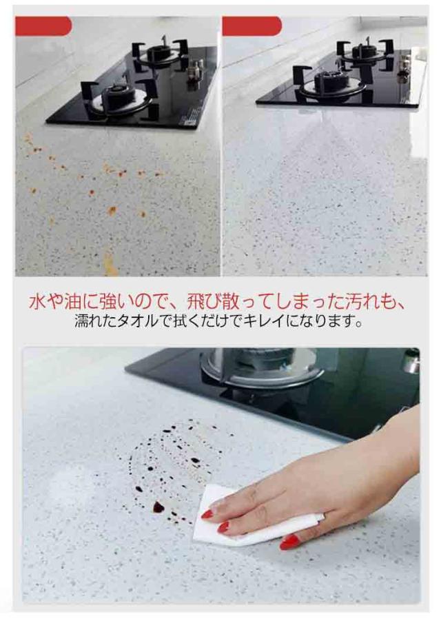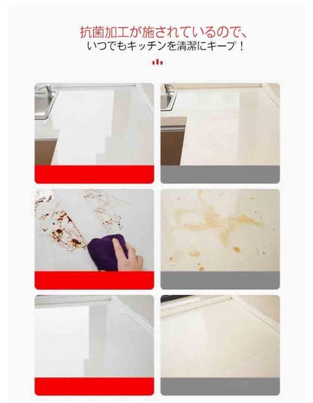 | 耐熱(265℃まで)・防水・防汚・抗菌!キッチンシート。 水や油に強いので、飛び散ってしまった汚れも、濡れたタオルで拭くだけでキレイになります。 抗菌加工が施されているので、いつでもキッチンを清潔にキープ! ツルツルとした光沢感がある無地タイプだから使う場所を選ばないです。 好きなサイズに合わせて、簡単にカットできます! 台所だけではなく、洗面台や戸棚、トイレまわり、浴室など幅広く使えるので便利です。 | |