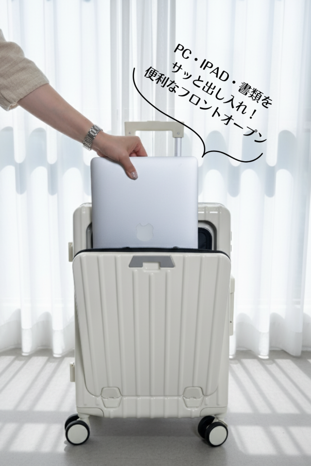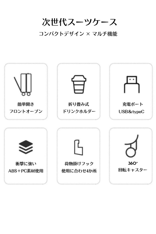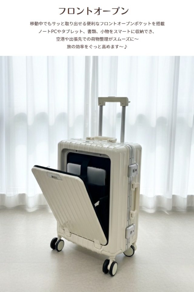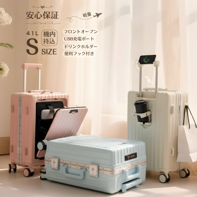 スーツケース キャリーケース 機内持ち込み ワンタッチオープン フロントオープン 前開き 軽量 キャリーバッグ TSAロック 充電ポート ドリンクホルダー カップホルダー スマホスタンド 荷物掛けフック 360度回転キャスター アルミフレーム 多機能 便利 キャリーハードケース