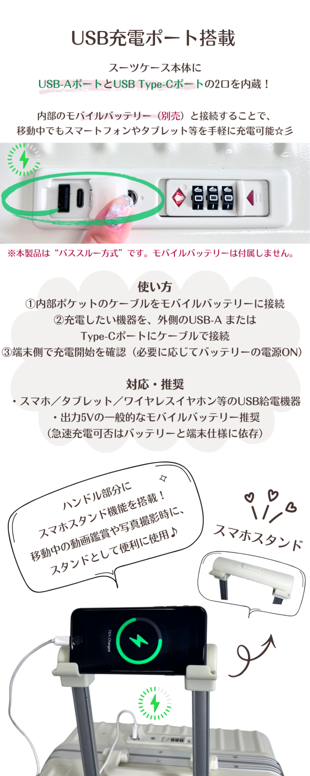 スーツケース本体にUSB-AポートとUSB Type-Cポートの2口を内蔵。 内部のモバイルバッテリー(別売)と接続することで、 移動中でもスマートフォンやタブレットを手軽に充電可能。 ※本製品はパススルー方式。モバイルバッテリーは付属していません。 |