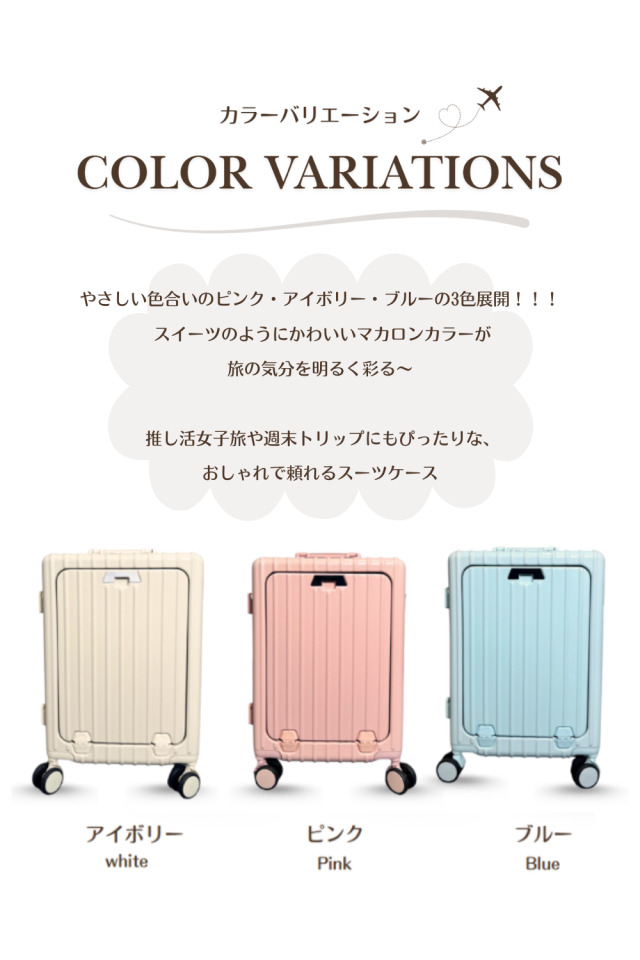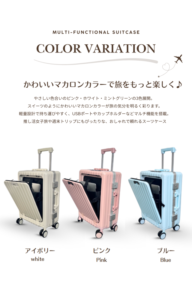 “これひとつで完結” 充電・収納・快適、全部そろった多機能スーツケース 機能性はもちろん!持っているだけで心ときめくマカロンカラーのスーツケース♪ |