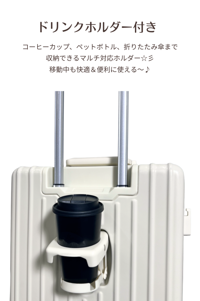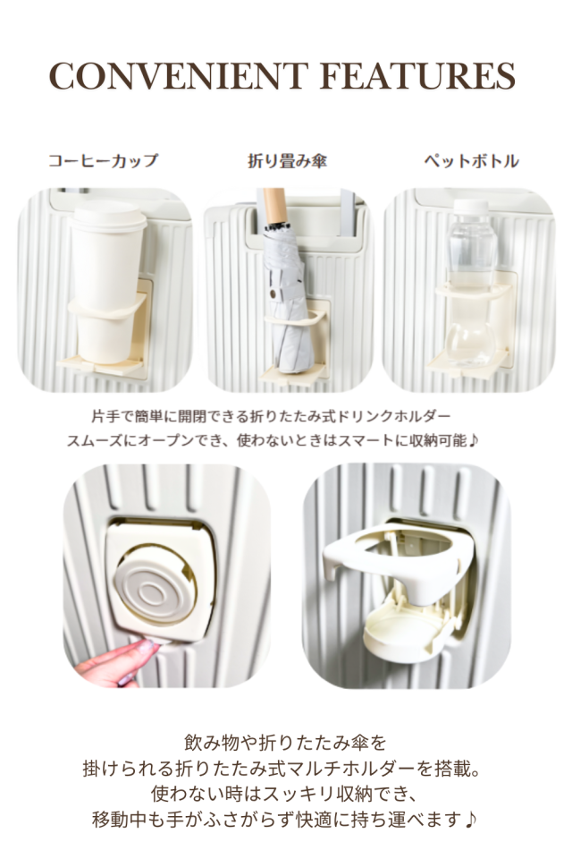 折りたたみ式のマルチホルダーを搭載。 ペットボトルやコーヒーカップ、折りたたみ傘を掛けられ、使わないときはスッキリ収納。 移動中も手がふさがらず快適に持ち運べます。 |