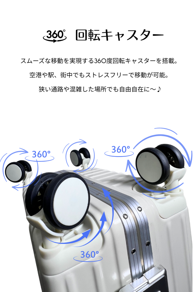 静音仕様の360°回転キャスターを搭載。 空港や駅でもスムーズに動かせ、狭い通路でも快適に走行できます。 |