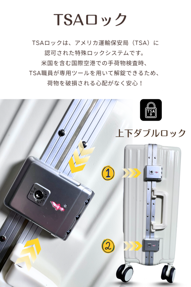 安心のTSAロックを搭載。 海外空港での検査にも対応し、鍵を壊される心配なく荷物を預けられます。 旅行中のセキュリティも万全です。 |