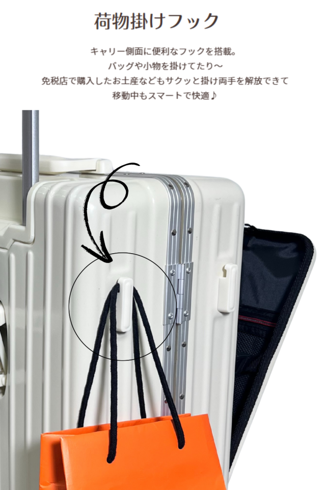 免税店で買ったお土産や小さなバッグもサッと掛けられる便利フック付き。 両手を自由にしてスマートに移動できます。 |