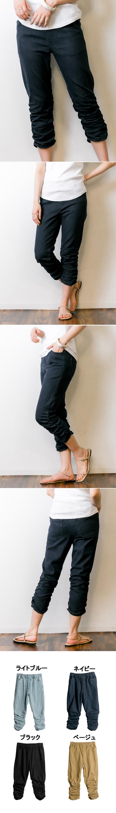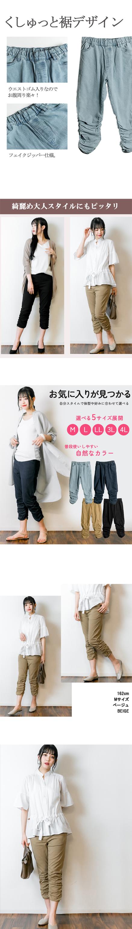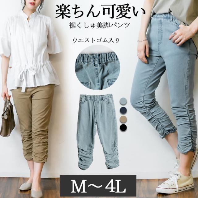 冬新作 裾くしゅ美脚パンツ レディース 7分丈 七分丈パンツ 動きやすい ウエストゴム 大きいサイズ レディース M L LL 3L 4L 黒 ベージュ ネイビー ブルー