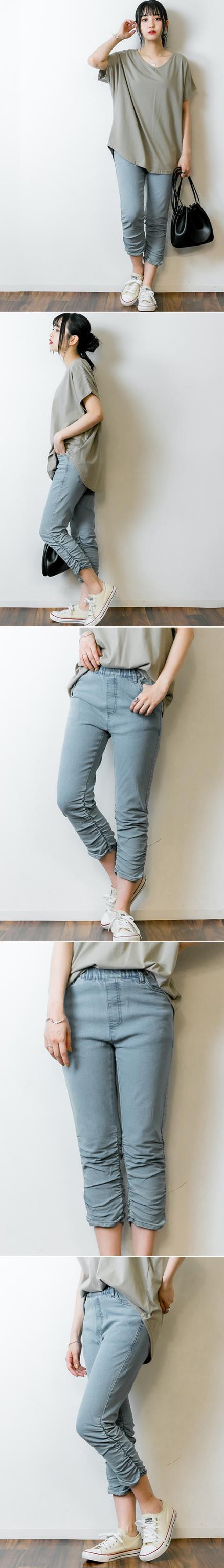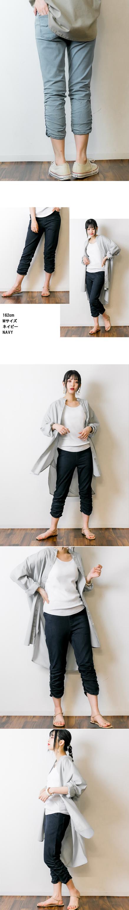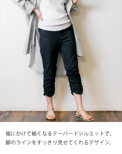| 裾のくしゅくしゅ感が目を引く七分丈パンツ。程よくフィットしつつ、脚のラインを拾いすぎないシルエットで、軽やかな印象に仕上げています。動きやすい素材感で、日常使いからちょっとしたお出かけまで幅広く活躍。裾のギャザーが足元にニュアンスを加え、パンプスやスニーカーなど合わせる靴によって表情が変わります。ウエストまわりはすっきり見せながら、快適なはき心地を意識したデザイン。季節の変わり目やアクティブなシーンにもおすすめの一本です。 |
