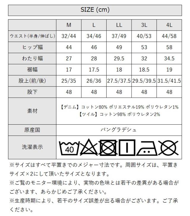 | [Mサイズ]ウエスト:64/88cm、ヒップ幅:88cm、わたり幅:27cm、裾幅:17cm、前股上:25cm、後股上:35cm、股下:48cm [Lサイズ]ウエスト:68/92cm、ヒップ幅:92cm、わたり幅:28cm、裾幅:17.5cm、前股上:26cm、後股上:36cm、股下:48cm [LLサイズ]ウエスト:74/98cm、ヒップ幅:98cm、わたり幅:29.5cm、裾幅:18cm、前股上:27.5cm、後股上:37.5cm、股下:48cm [3Lサイズ]ウエスト:80/106cm、ヒップ幅:106cm、わたり幅:32cm、裾幅:18.5cm、前股上:29.5cm、後股上:39.5cm、股下:48cm [4Lサイズ]ウエスト:88/116cm、ヒップ幅:116cm、わたり幅:34.5cm、裾幅:19cm、前股上:31.5cm、後股上:41.5cm、股下:48cm ※平置き実寸サイズとなります為、若干の誤差が生じる場合がございます。 |