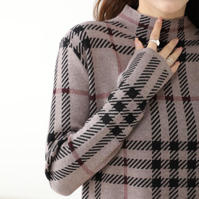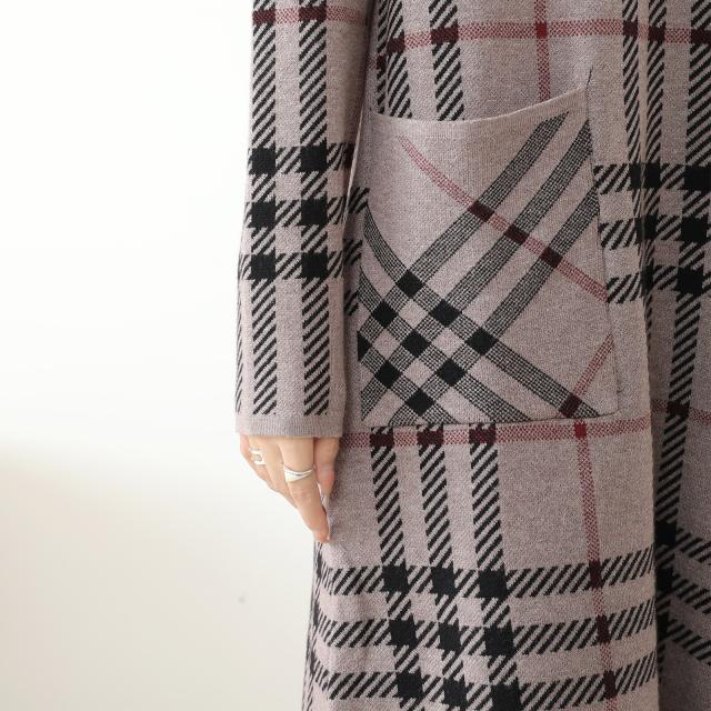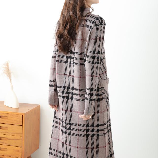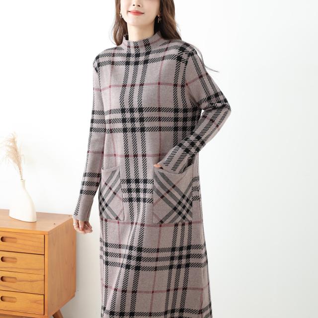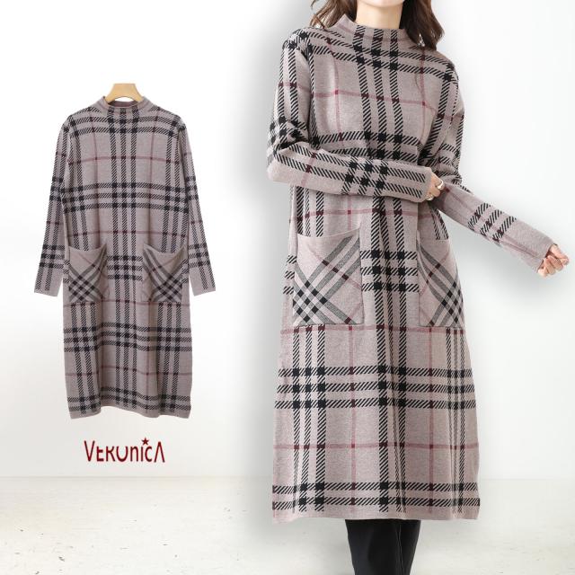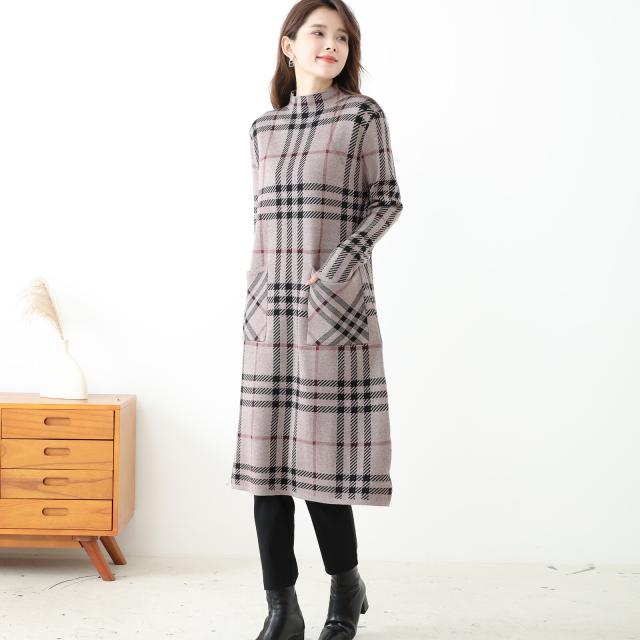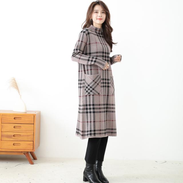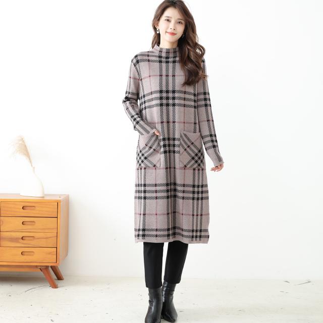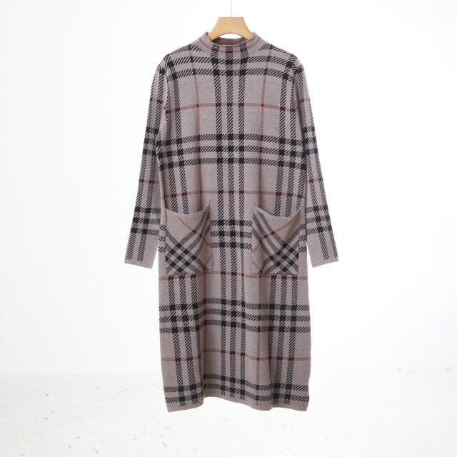 【即納】チェック柄ニットワンピース 膝丈 膝下丈 体型カバー AW 秋冬 新作