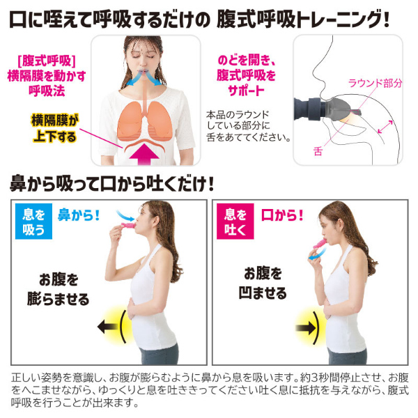 腹式呼吸で腹圧トレーニングができるカロリーブレス。吸って吐いて3段階の強度調節で甘えたお腹に喝!■1日5分スーハ—するだけで簡単ブレストレーニング!マウスピースをくわえて20回深呼吸するだけでトレーニングができます。短時間で手軽にエクササイズができ、無理なく続けられます。■3段階レベル調節可能で自然と身に付く腹式呼吸。ジャバラタイプで伸ばしたり縮めたりするだけで簡単に3段階の強度を調節できます。お好みのレベルに合わせて使えます。■コンパクト。小さくてバッグに入るので、いつでもどこでも好きな時間に手軽に肺活量トレーニングできます。■丸ごと洗えて清潔♪水洗いできるのでお手入れ簡単で衛生的です。