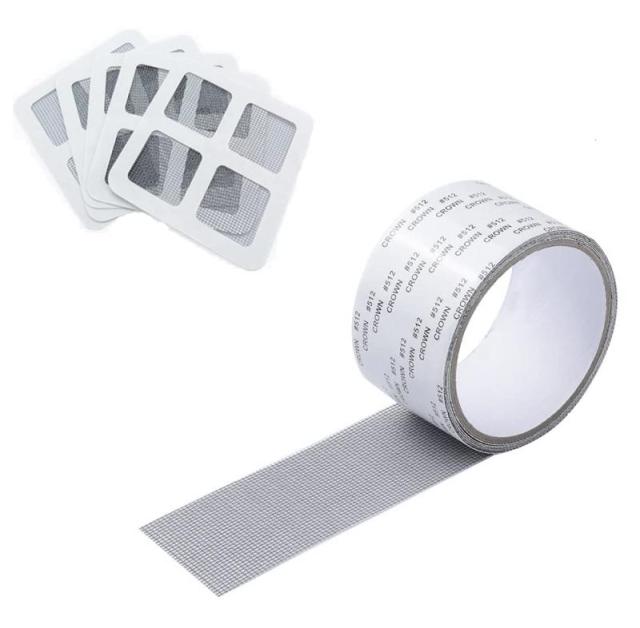 【商品情報】網戸パッチ*10枚。サイズ:100mm*100mm。網戸補修テープ*1ロール。サイズ:50mm×2m。穴やほつれ、破れの程度に合わせてカットして使えます。カラー:グレー ,素材:ガラス繊維+粘着性が強いリアル両面テープ.