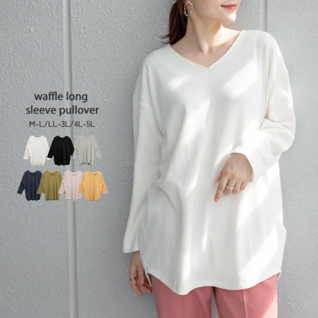 冬新作 大きいサイズ レディース ワッフルロングスリーブプルオーバー 大きいサイズ レディース カットソー トップス ワッフル 長袖 ロンt きれいめ Vネック 春