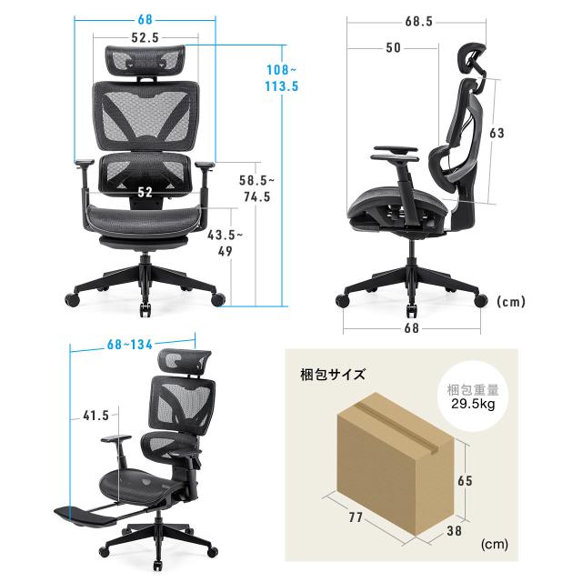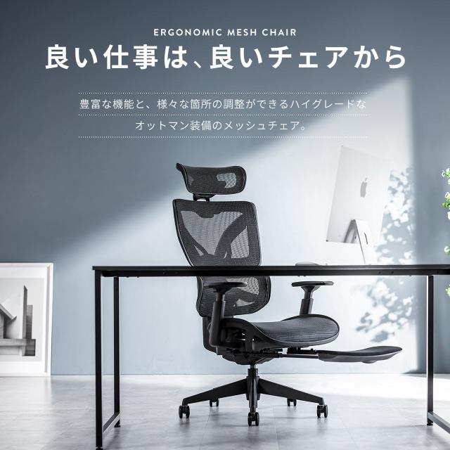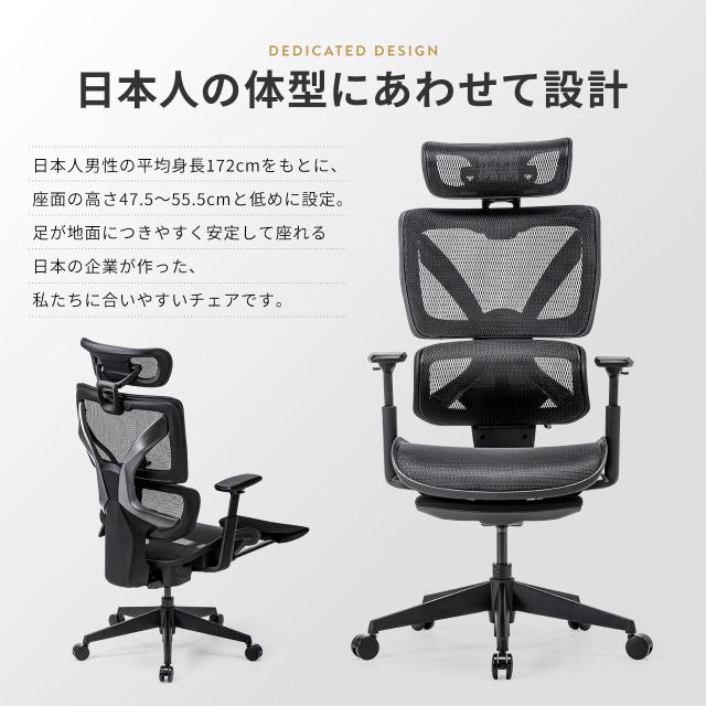 ⇒ご購入の前にご確認下さい座面の高さが低めで日本人の体形に相応しいメッシュチェア。せり出たランバーサポートが姿勢を矯正。脚が浮かび上がらないシンクロロッキング採用。レバー操作で座面が前後スライド。背もたれ高さを4段階で調節可能。スライド式薄型オットマン内蔵。直径6cmの大型ナイロンキャスター採用。【WEB限定商品】