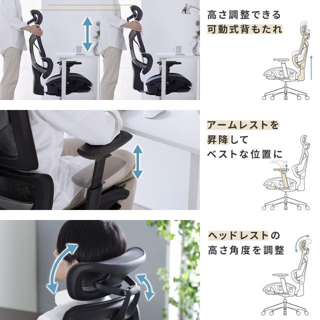 ■背もたれ:4段階の角度固定、腰の位置に合わせて上下調整可能