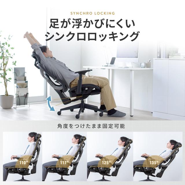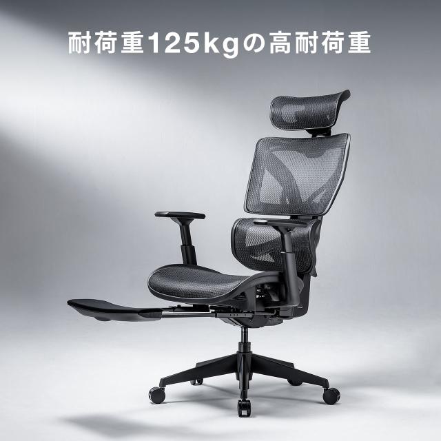 メッシュチェア オフィスチェア エルゴノミクスチェア 高耐荷重125kg シンクロロッキング ハイバック スライド式オットマン アームレスト 座面スライド 上下可動ヘッドレスト ランバーサポート[150-SNCM38]