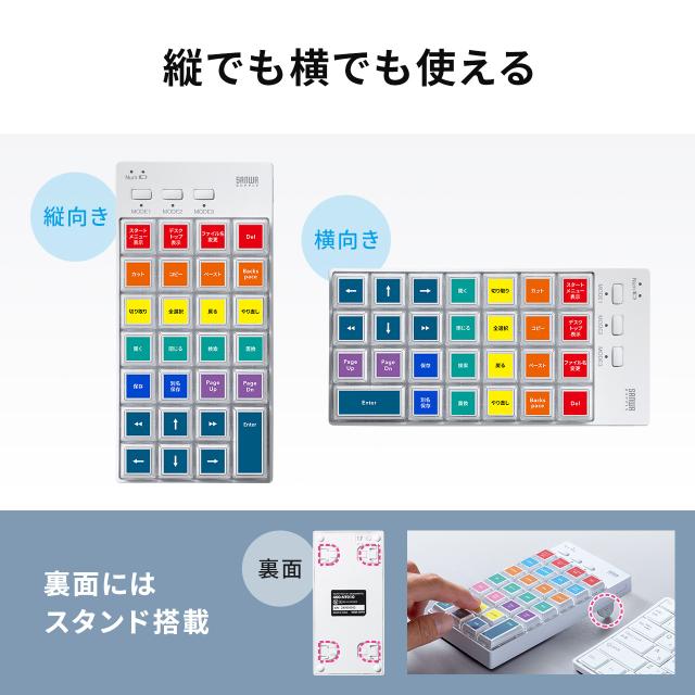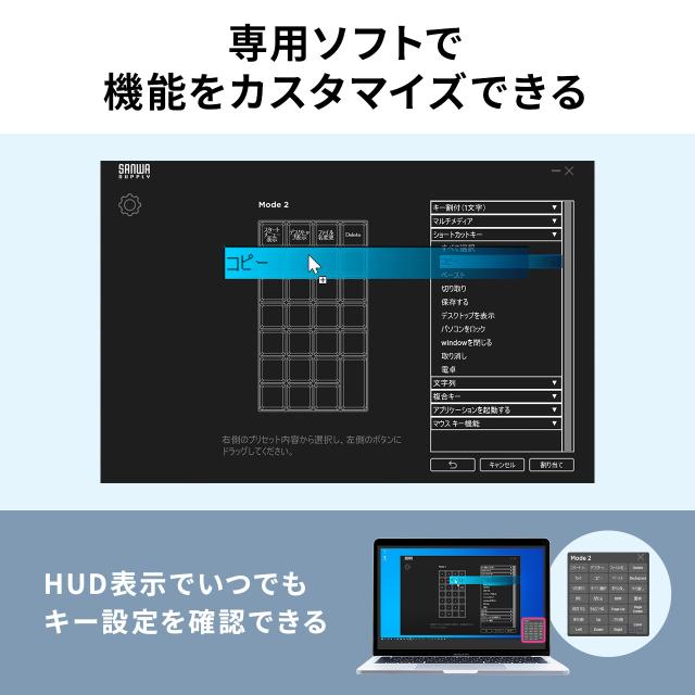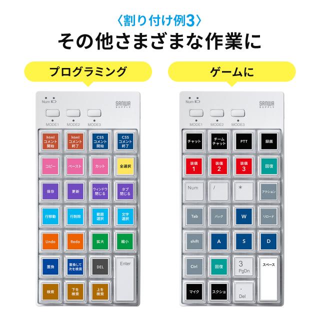 ●専用ソフトでショートカットなどの機能を割り当てることができるプログラマブルテンキーです。●3つのモードボタンを切り替えることにより、最大62キーに割り当てることができます。