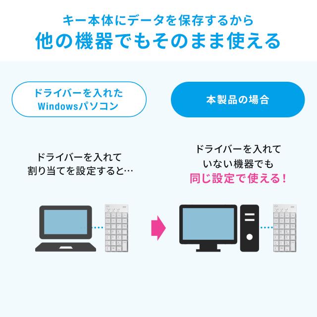 ●割り当てた機能はテンキーのメモリに記憶されているので、一度設定すれば専用ドライバの入っていないパソコンでも同じ機能が使えます。