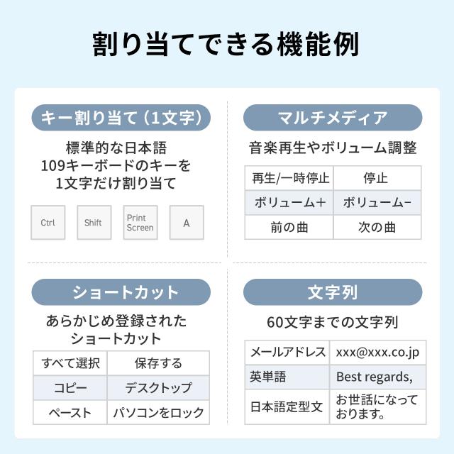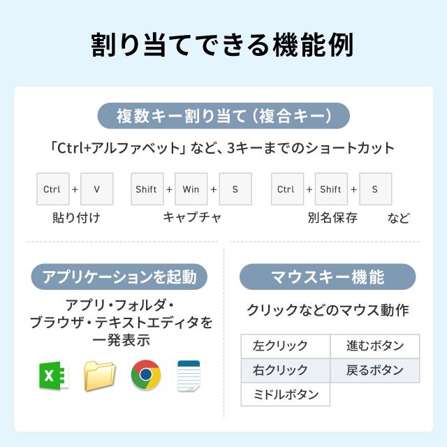 ・複数キー割り当て(複合キー):「Ctrl+C(コピー)」といった複数キー同時押しの割り当てができます。