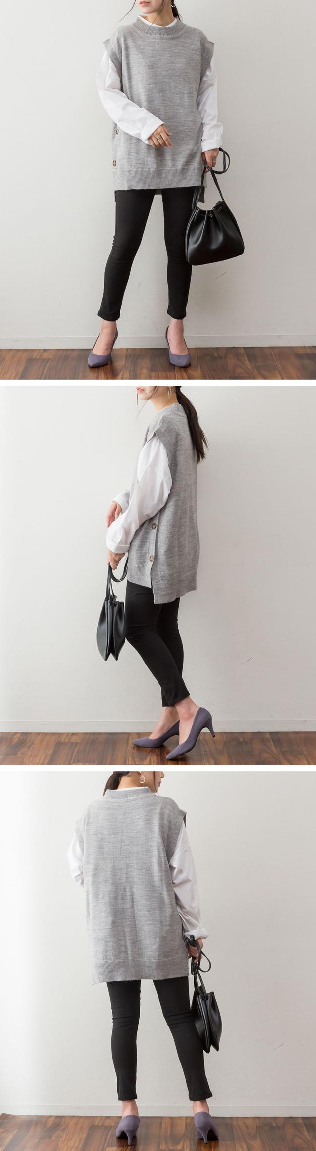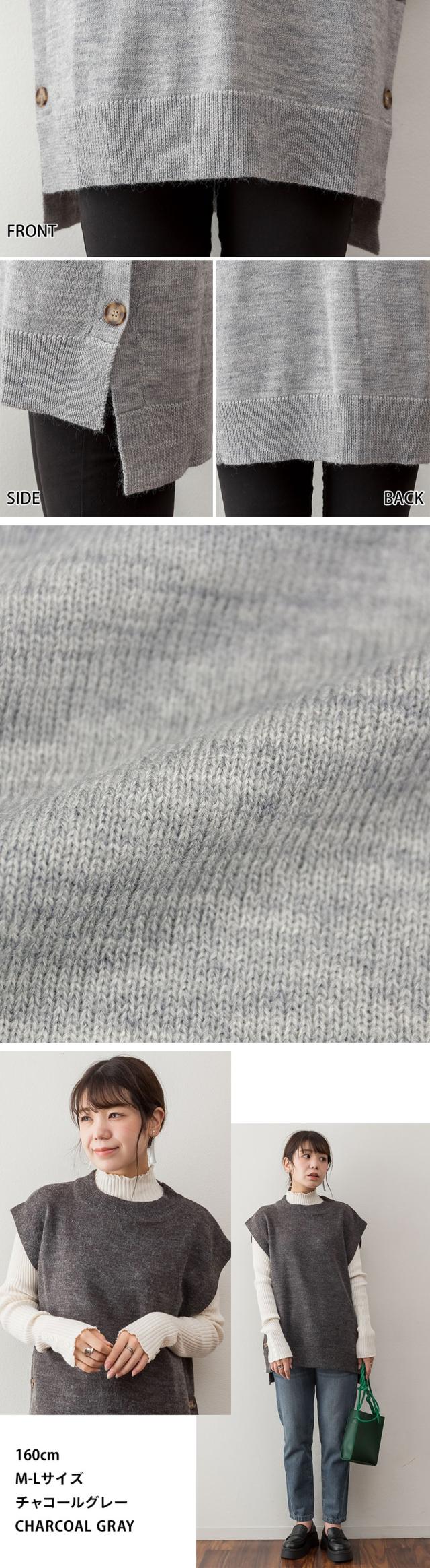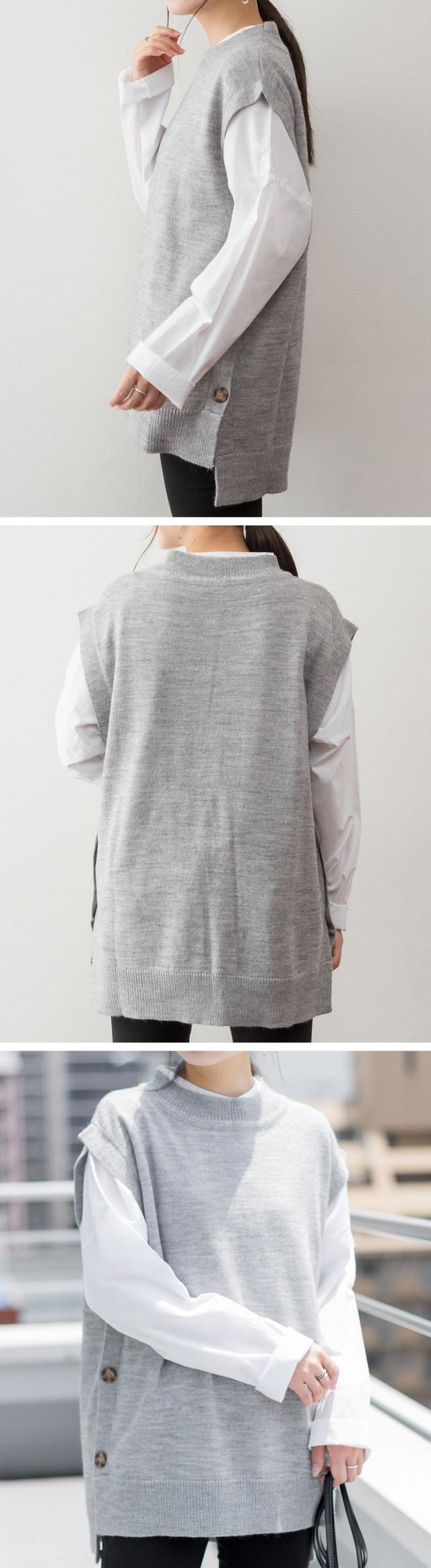 | ゆったりとしたシルエットで、重ね着を楽しめるサイドボタンニットジレ。 ヒップラインまで届く長めの丈感で、気になる腰まわりを自然にカバーしてくれます。 両サイドにあしらわれた大きめのボタンは、留め方次第でシルエットを変えられるのがポイント。外してレイヤードを見せたり、留めてすっきりまとめたりと、着こなしに幅が広がります。 やや厚みのあるニット素材は、アクリル×ナイロンの柔らかさと軽やかさを両立。シャツやカットソー、ワンピースなど、季節を問わず重ねやすい質感です。 前後差をつけた裾デザインとスリット入りで動きやすさもあり、日常使いから通勤まで活躍♪ デニムと合わせたカジュアルスタイルや、ワンピースに重ねたフェミニンな着こなしなど、幅広いコーディネートに取り入れやすい一枚となっております! |