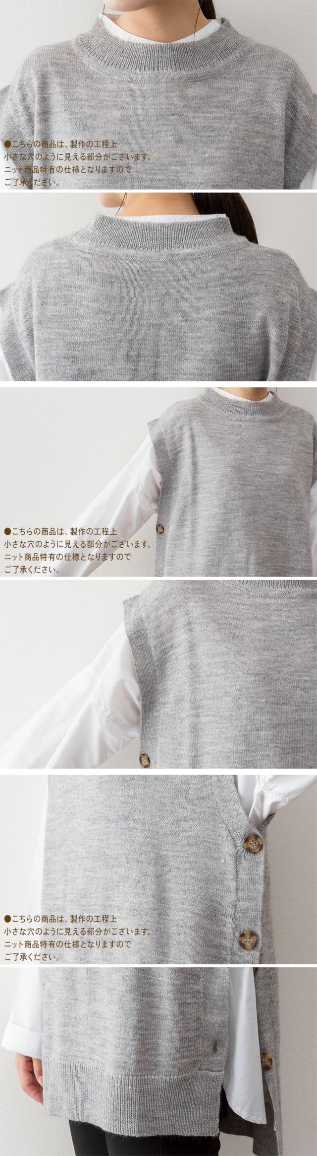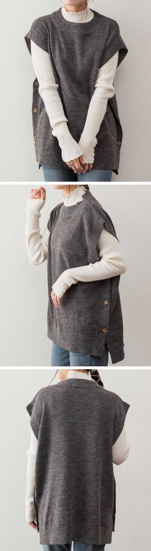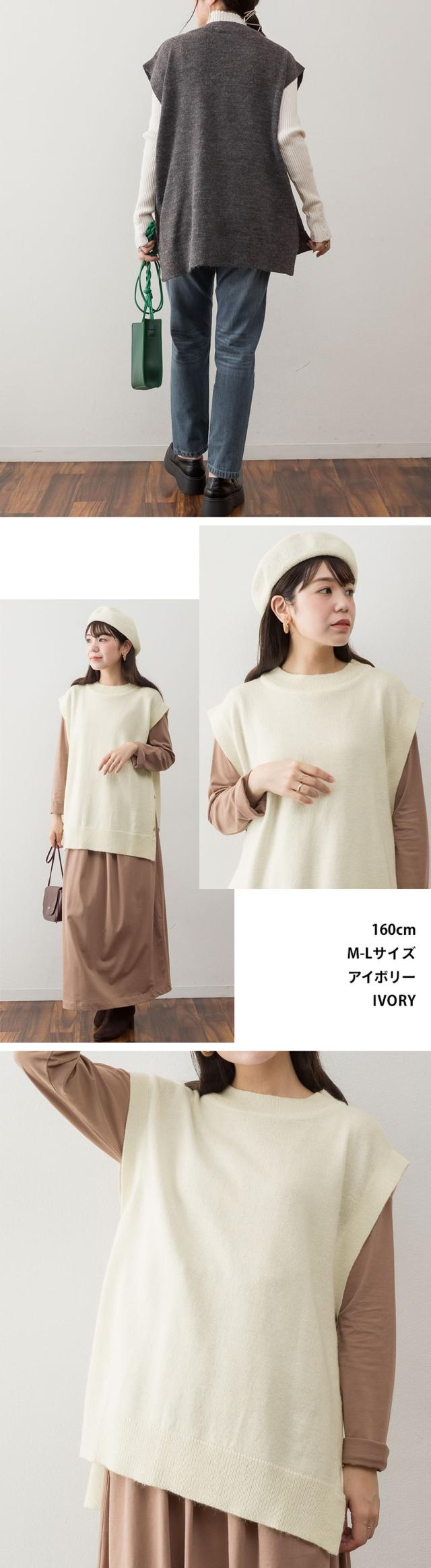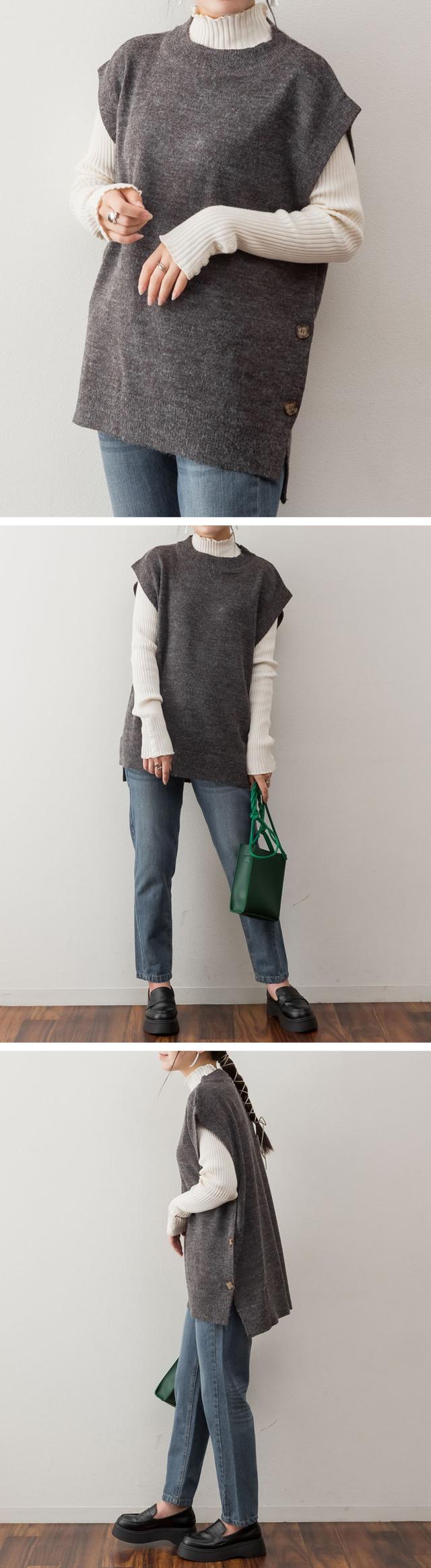 | ゆったりとしたシルエットで、重ね着を楽しめるサイドボタンニットジレ。 ヒップラインまで届く長めの丈感で、気になる腰まわりを自然にカバーしてくれます。 両サイドにあしらわれた大きめのボタンは、留め方次第でシルエットを変えられるのがポイント。外してレイヤードを見せたり、留めてすっきりまとめたりと、着こなしに幅が広がります。 やや厚みのあるニット素材は、アクリル×ナイロンの柔らかさと軽やかさを両立。シャツやカットソー、ワンピースなど、季節を問わず重ねやすい質感です。 前後差をつけた裾デザインとスリット入りで動きやすさもあり、日常使いから通勤まで活躍♪ デニムと合わせたカジュアルスタイルや、ワンピースに重ねたフェミニンな着こなしなど、幅広いコーディネートに取り入れやすい一枚となっております! |