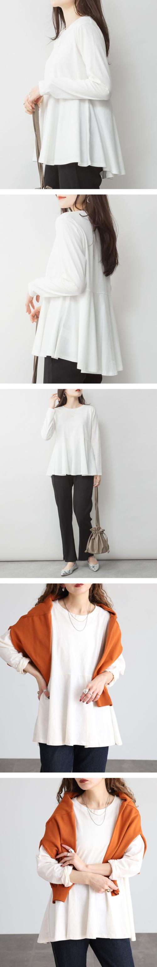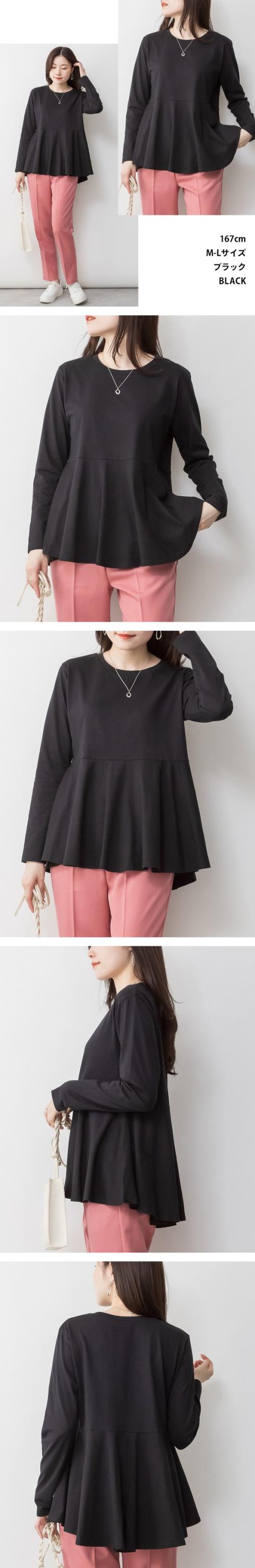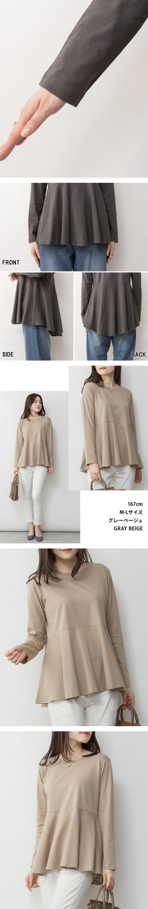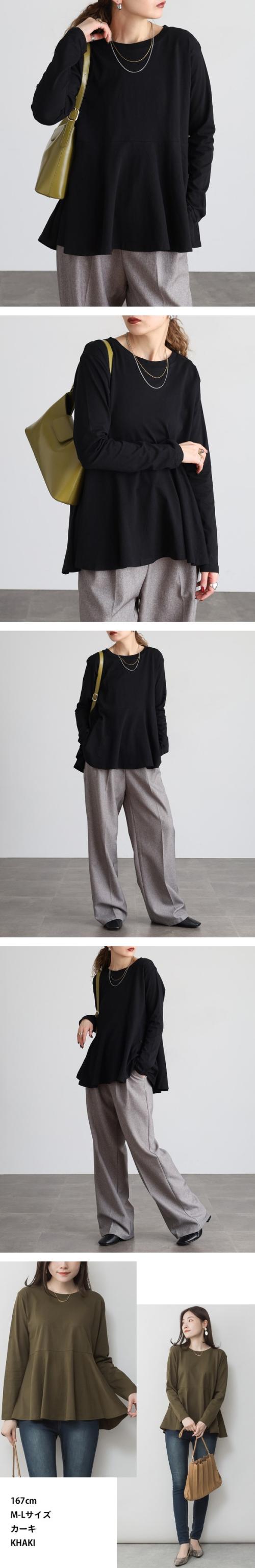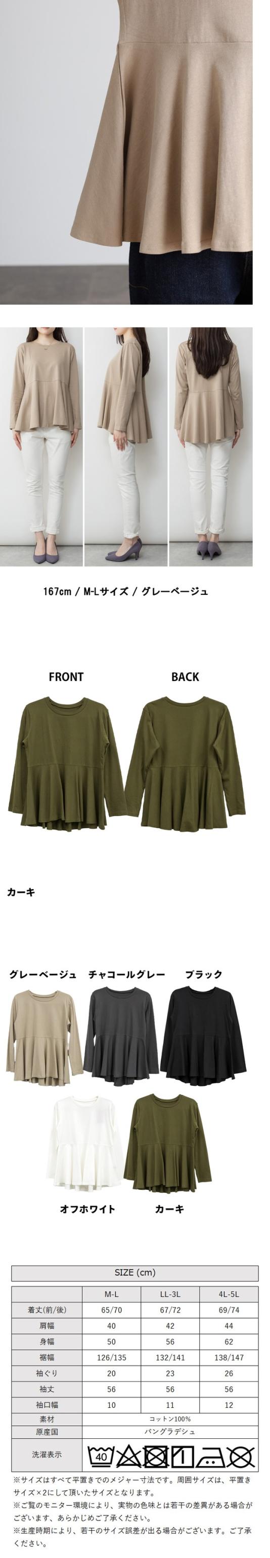 裾フレア長袖カットソー◇POINT女性の柔らかさを表現する裾フレアデザインが秀逸。前後差のあるシルエットでヒップまでカバー出来て、ゆったりと着られます。一枚だけ着てても十分魅力的なカットソーです。◇SIZEM〜5Lまでの豊富なサイズ展開で大きいサイズ・ワイドサイズ対応も嬉しいポイント!サイズ展開が豊富なので、ワンサイズアップでビックシルエットでの着こなしもおすすめです!◇FABRIC耐熱性・吸水性・通気性に優れ、柔らかな肌触りのコットン。◇COORDINATEシンプルにデニムパンツ(ジーンズ)やイージーパンツ、ワイドパンツに合わせるカジュアルスタイルも◎カラーパンツやスラックス、スリットスカートやタイトスカートと合わせてきれいめフェミニンにも好相性!サマージャケットやロングジレ、ニットカーディガンなどとのレイヤードスタイルにもぴったり♪こなれ感をプラスしてキャスケットやバケットハット、ミニバッグやスマホショルダーなどの小物を合わせるのもおすすめです。